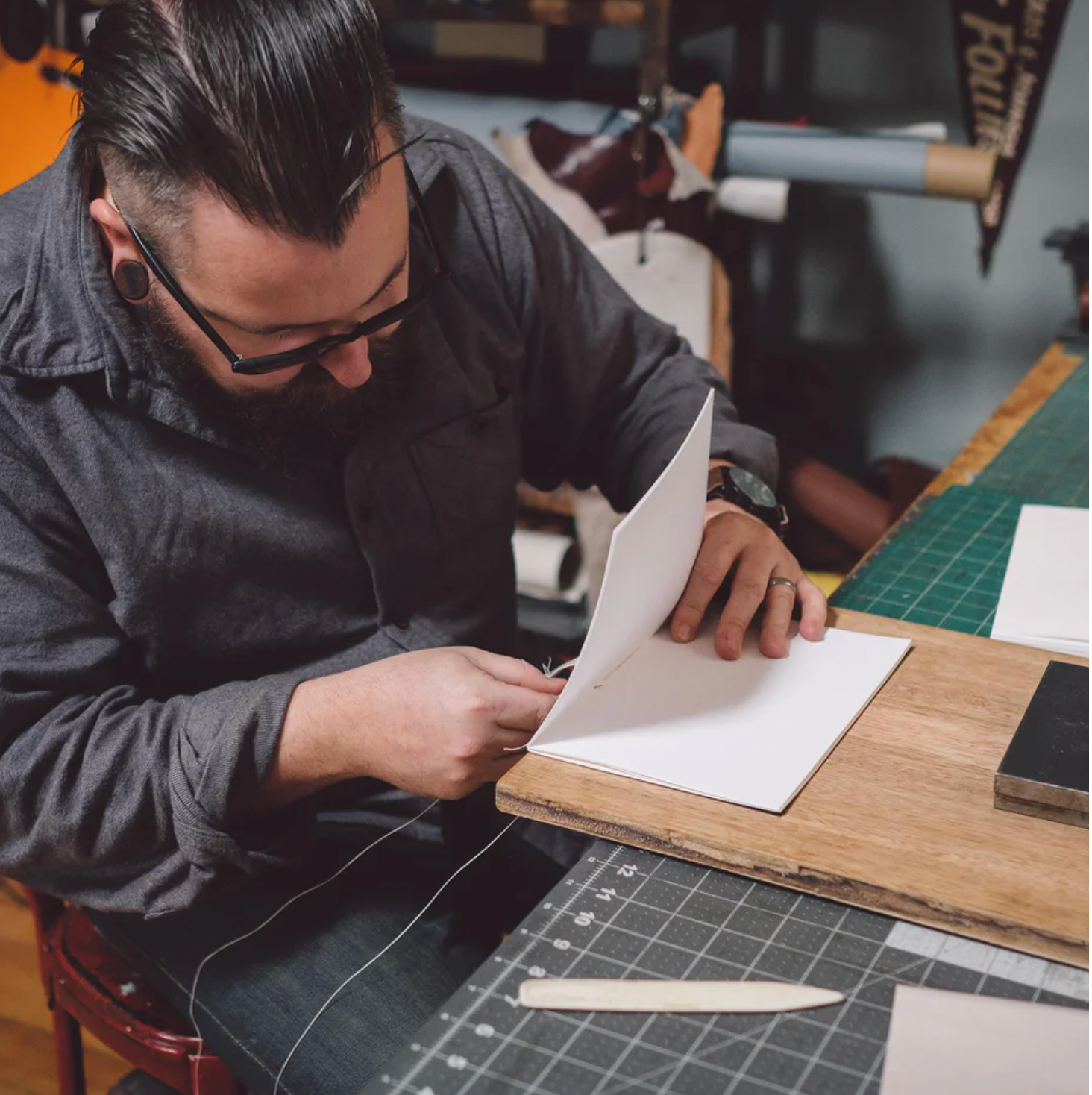 Made by hand in Brandon, VT, by a bookbinder and leatherworker who is also a stay-at-home dad.