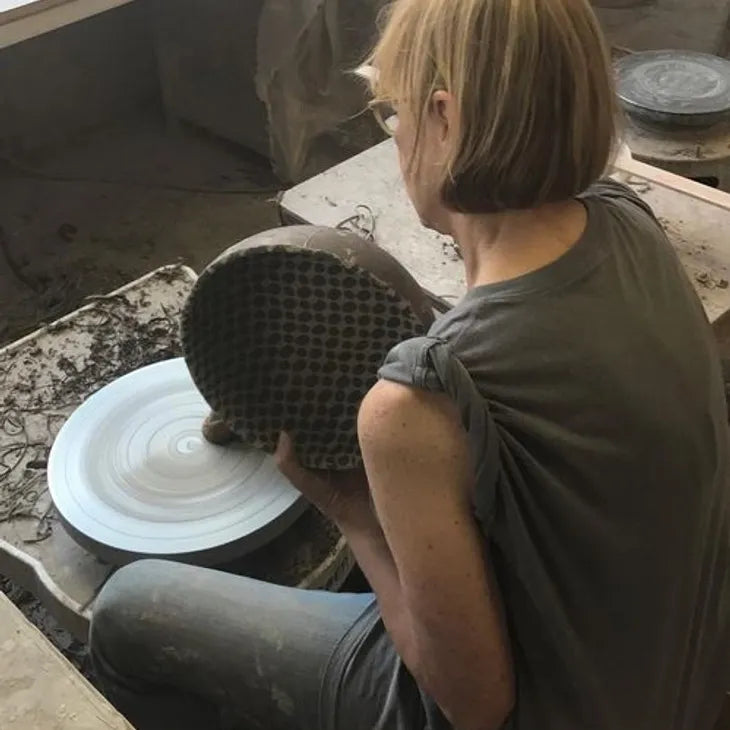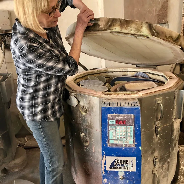As owner and artistic director of the Terrafirma studio, Ellen's creative focus is to design and produce high quality, functional works of art for the table and home using a unique, original process. Patterns are created by painting through textiles and lace using liquid porcelain to produce a distinctive "one of a kind" result. The base of warm, natural stoneware juxtaposed with vibrantly colored and patterned porcelain surfaces achieves the casual yet sophisticated look that has become her signature in both dinnerware and accessories.