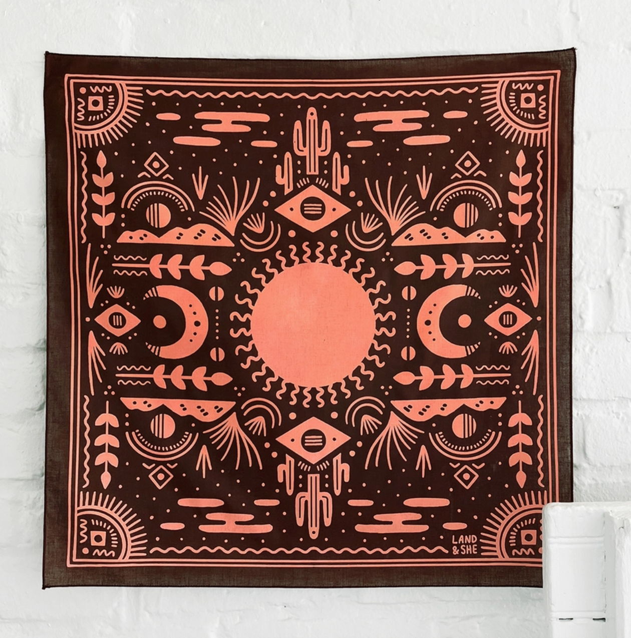 100% cotton bandana with original artwork by Land & She. Bandana color is a beautiful olive green with design printed in burnt orange and cream.