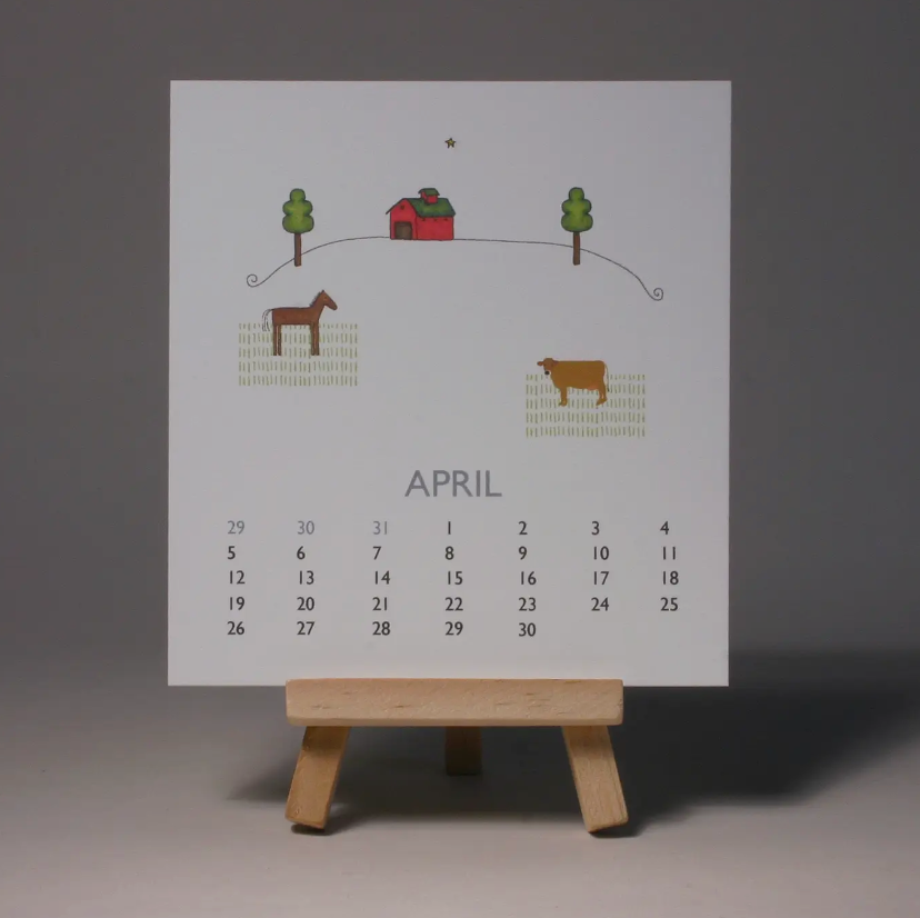 a calendar for 2026 featuring 12 new illustrations depicting the 12 months. printed on beautiful recycled card stock, and packaged in a lovely kraft box. The calendar comes with both an easel and a clip, if you prefer to hang it. The calendar pages are 4 5/8 x 5 inches.