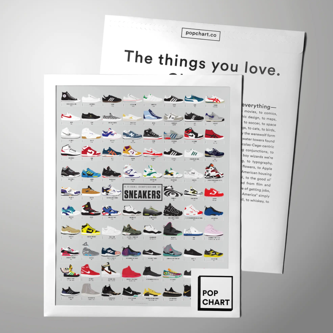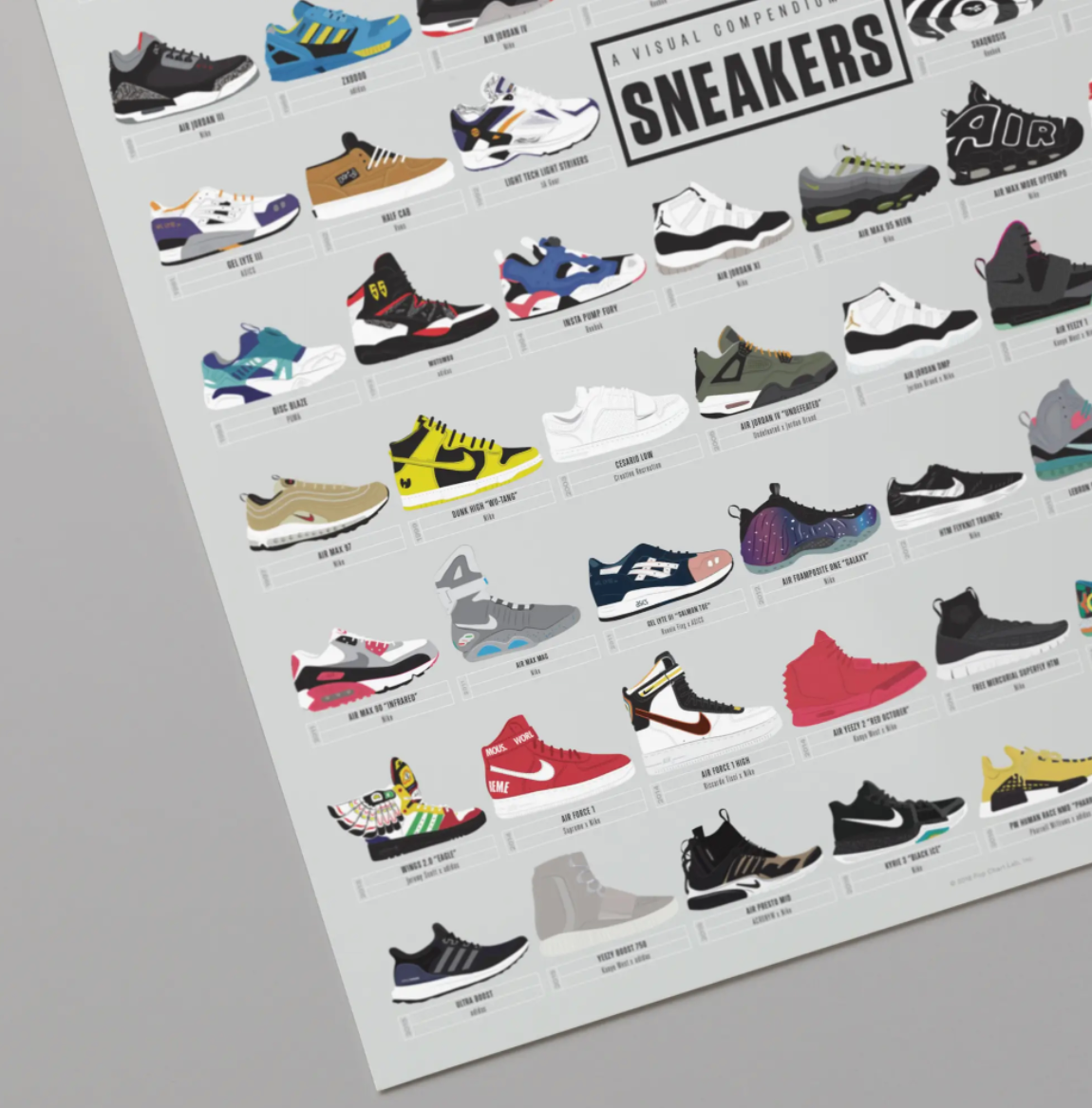Take a tour through sneaker history with this compendium of famous footwear! A cornucopia of 80 kicks in all, including ageless Adidas designs, the many permutations of Air Jordans, golden age Reeboks, and even high-fashion collabs like the Air Yeezy, this pumped-up print is sure to find good footing on the wall of any sneakerhead. 16" x 20" lithographic print on 100# cover stock. Ships in a branded envelope.