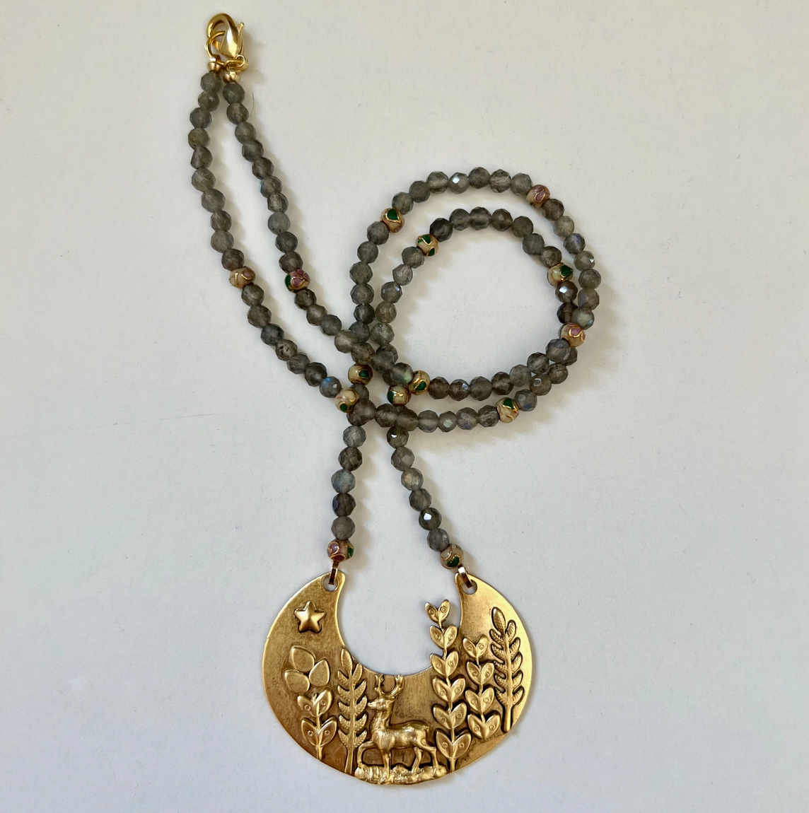 Indulge in the enchanting charm of this collection's highlight - the Allegra Necklace! Immerse yourself in its whimsical beauty, inspired by the majestic deer and serene forest. With your choice of faceted Labradorite or stylish chain, you can't go wrong with either option. Don't miss out on this must-have piece!