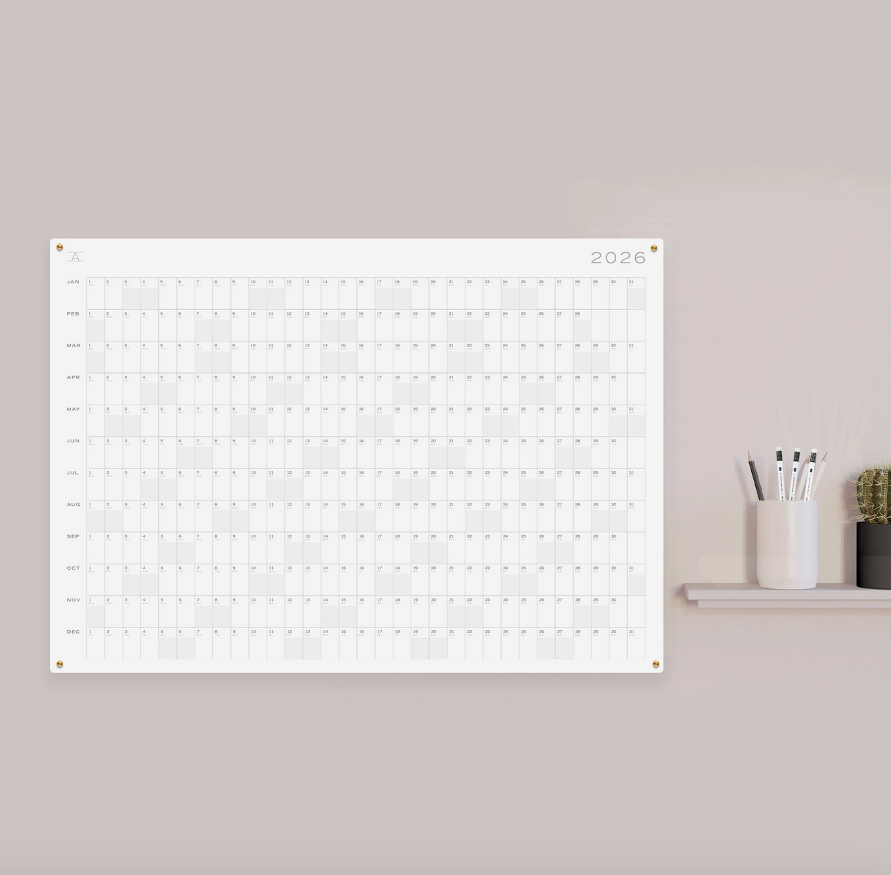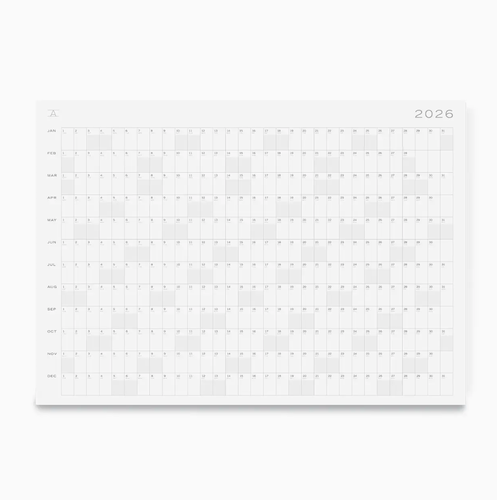 Meet the 12-month Annual Planning Calendar. Thoughtfully designed as a home base for big-picture projects, planning, and organizing, this extra-large one-page calendar allows you to tackle big goals and complex timelines at a glance. Each month runs horizontally across the page, with perfectly-sized daily boxes to capture deadlines and events. Days of the week are labeled, and weekends are shaded light gray for easy reference. Featuring smooth 100 lb stock, impactful 24” × 18” size, and fresh, minimal design that compliments any space. Whether you’re managing a product launch, coordinating summer childcare, or simply want a clear view of the year ahead, this wall calendar will keep you organized and on track.