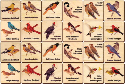 The Birds Memory Tile Set comes with 24 tiles (12 pairs) with a brightly colored and named bird images on one side and the Maple Landmark logo on the other. Each tile measures 2.5" square by 1/8" thick and is cut from high quality birch plywood. A cloth pouch for storage and instructions are included.This is a fun way to teach children about the world around them!