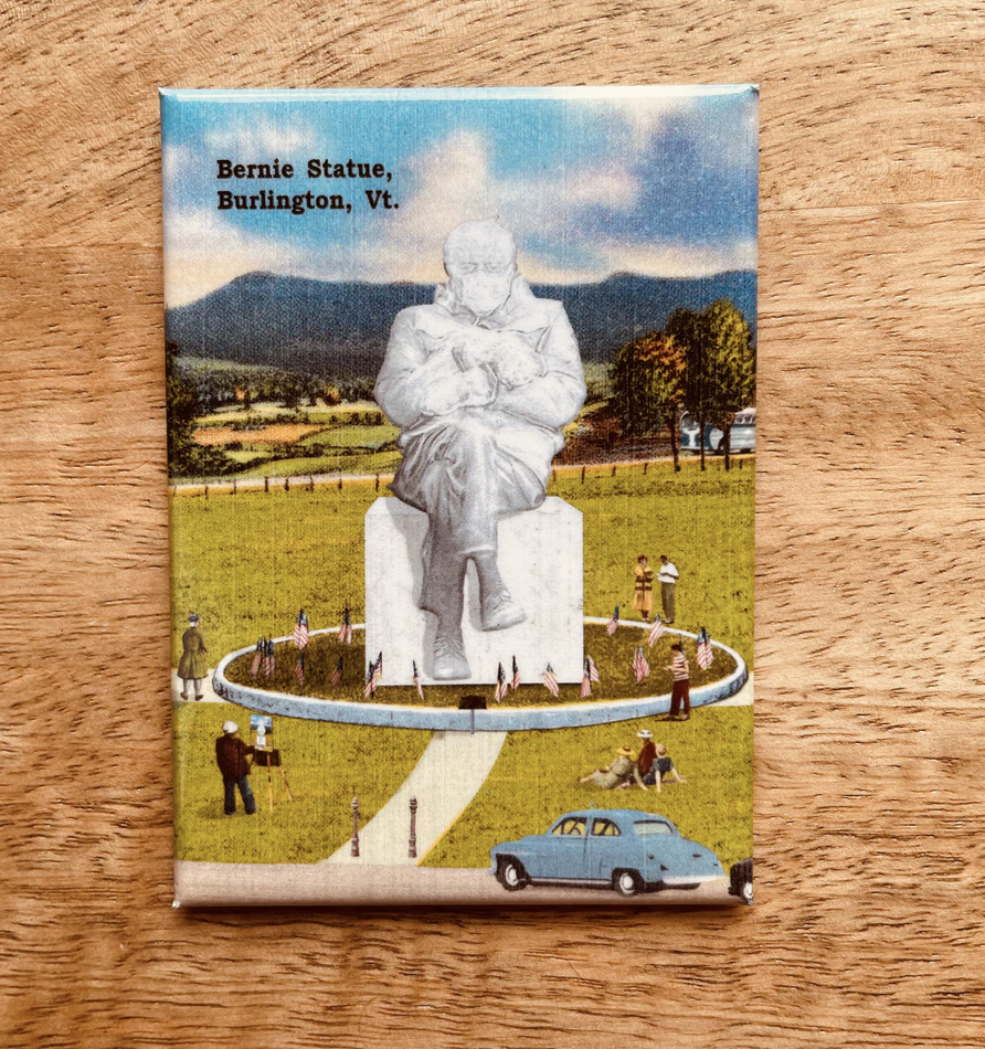Bernie sitting in mask and mittens is immortalized in this statue and on this magnet. This 2.5"x3.5" heavy-duty magnet is rather strong and manufactured in the U.S.A.