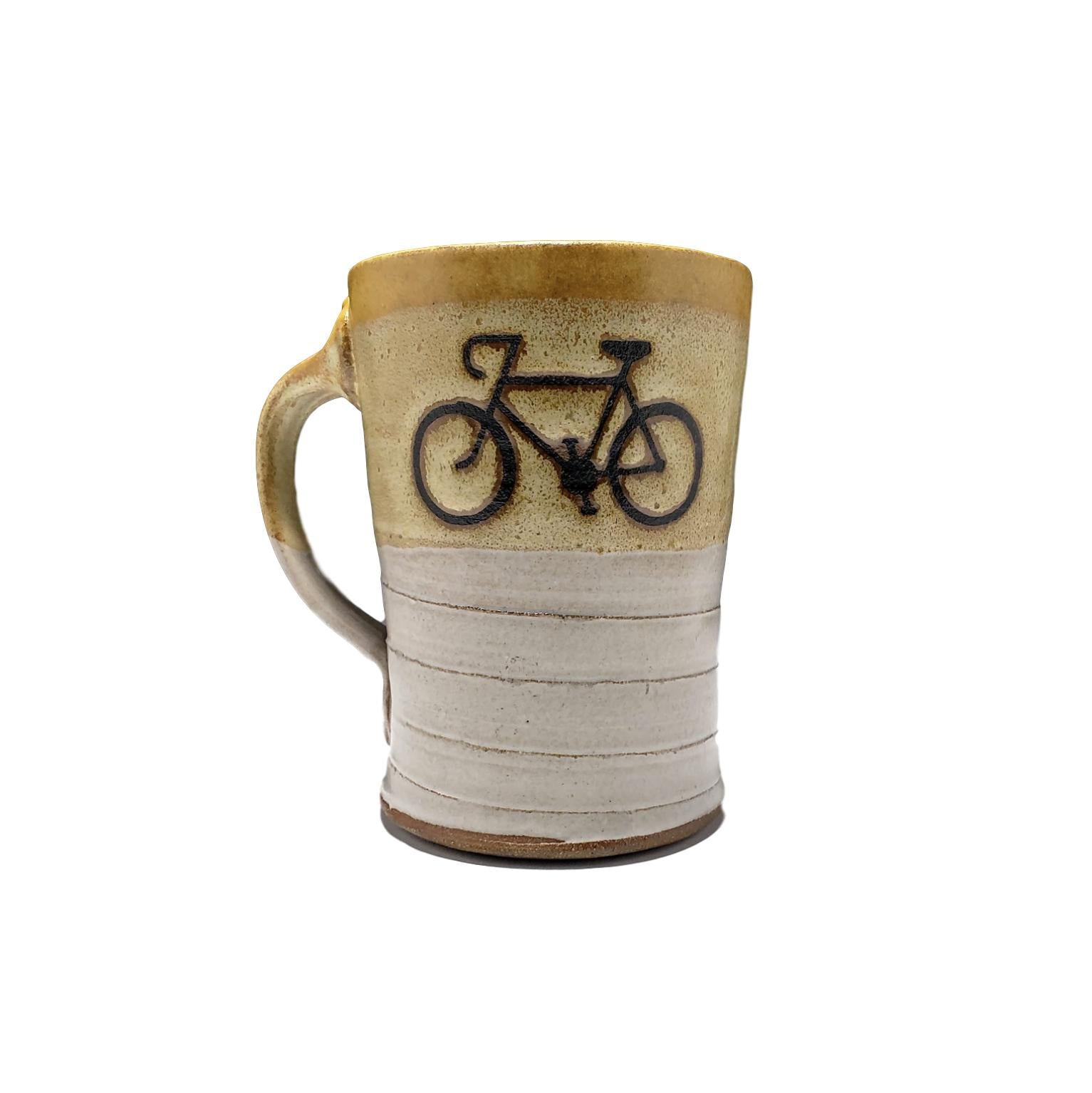 For the bicyclist enthusiast. Clean and visually strong - this mug has a clean yellow top glaze, that blends into a white glaze on the bottom. The bike logo is front and center on the front of the mug. Each mug is handmade so slight differences in size, shape, and glaze color can occur throughout the making process. Each mug is dishwasher and microwavable safe. The bicycle mug measures at 4.25'' h x 3.5'' w x 3.5'' d and holds between 12 - 15 oz.