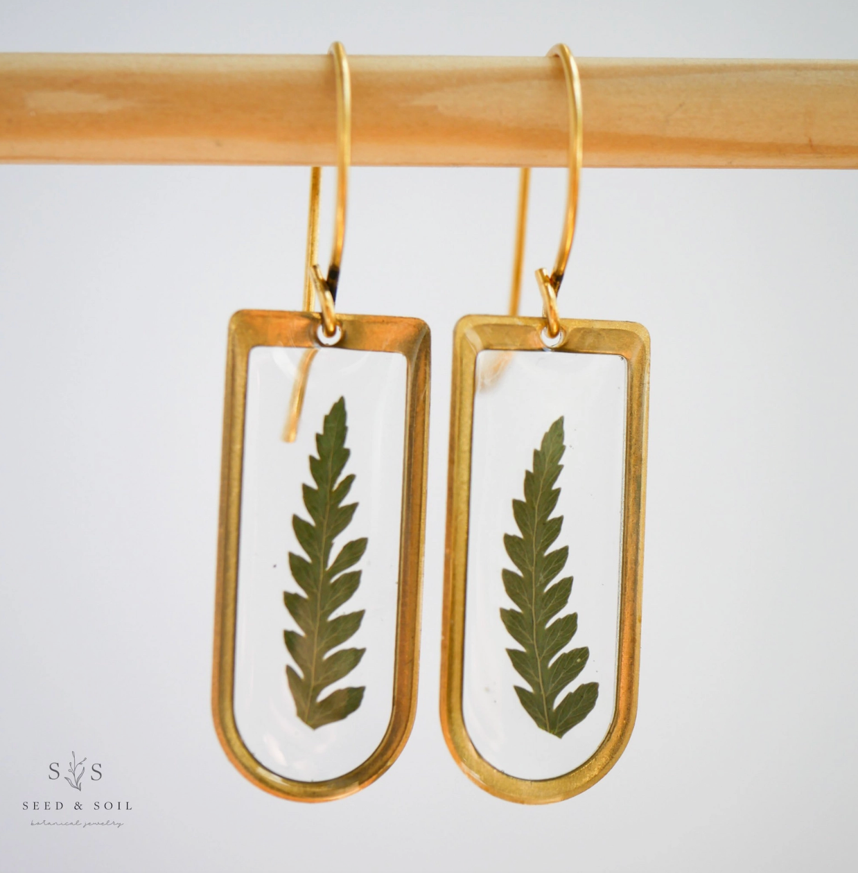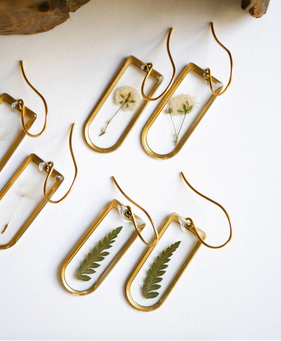 Tiny cathedral window shaped brass frames hang from 24k gold plated ear hooks. The Fern is a symbol of sincerity-- and these earrings feature real preserved ferns. All materials are nickel and lead free.