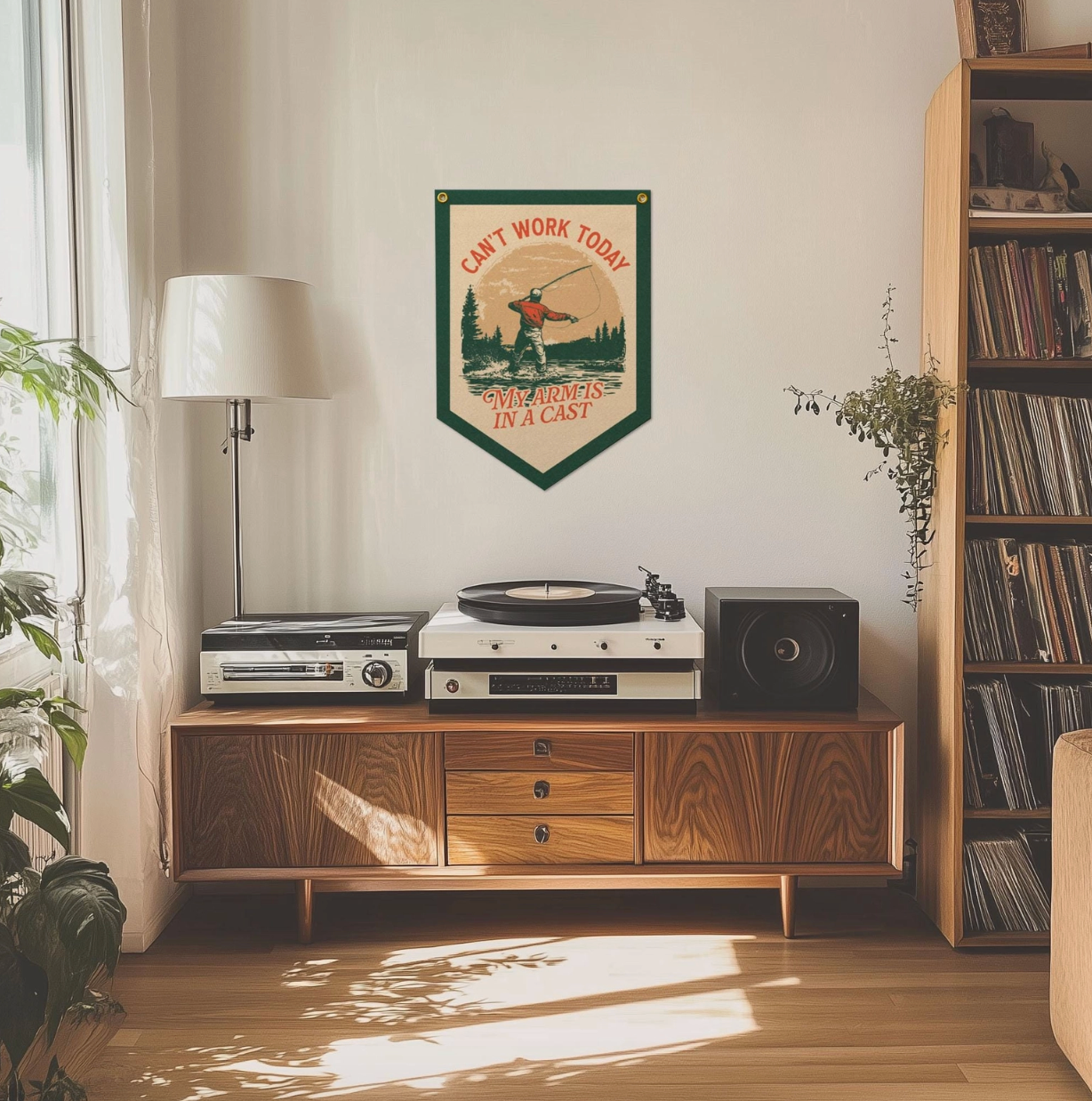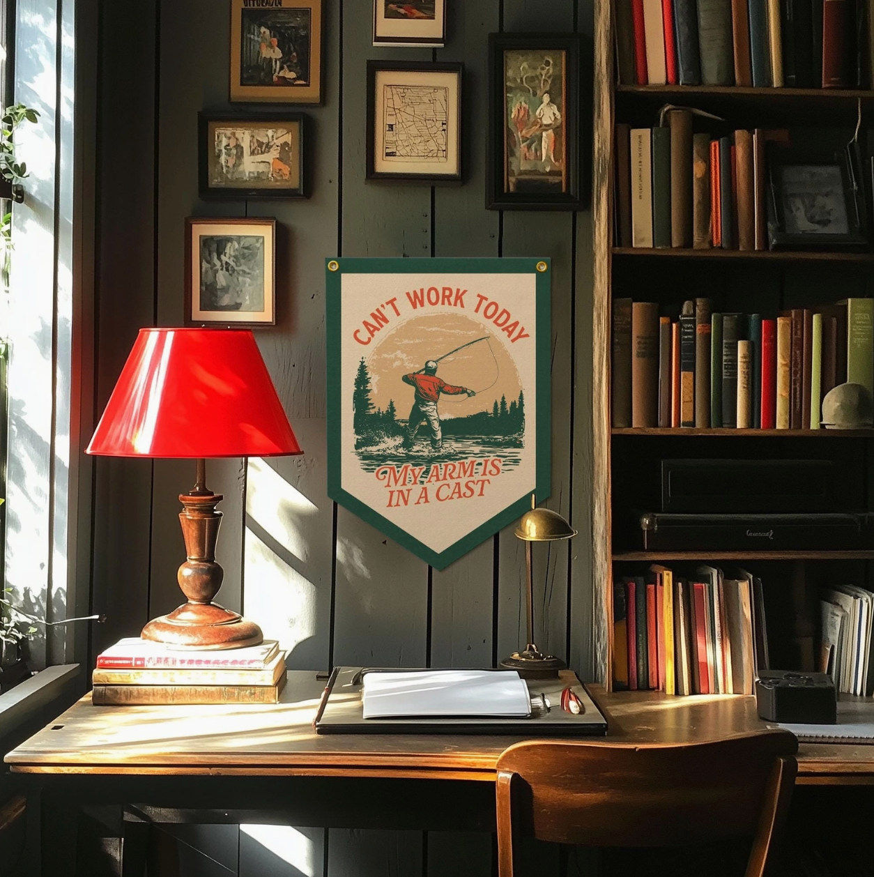 Call out of work and go fishing with this vintage style "Can't Work Today My Arm Is In A Cast" felt camp flag! The perfect funny gift for those loved ones who are always Gone Fishing.