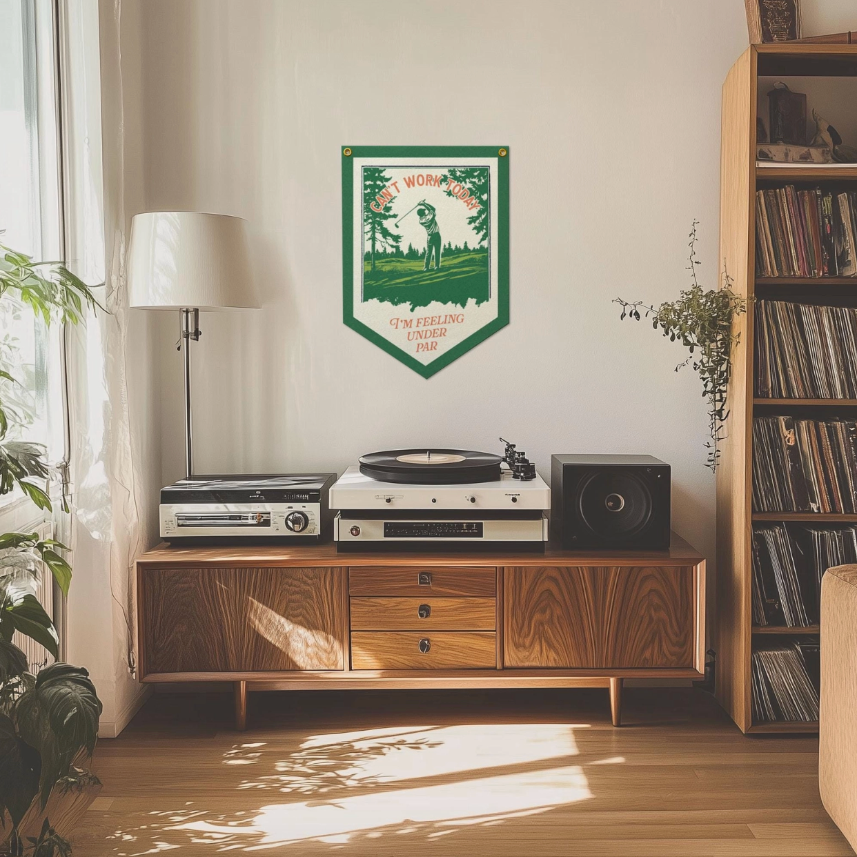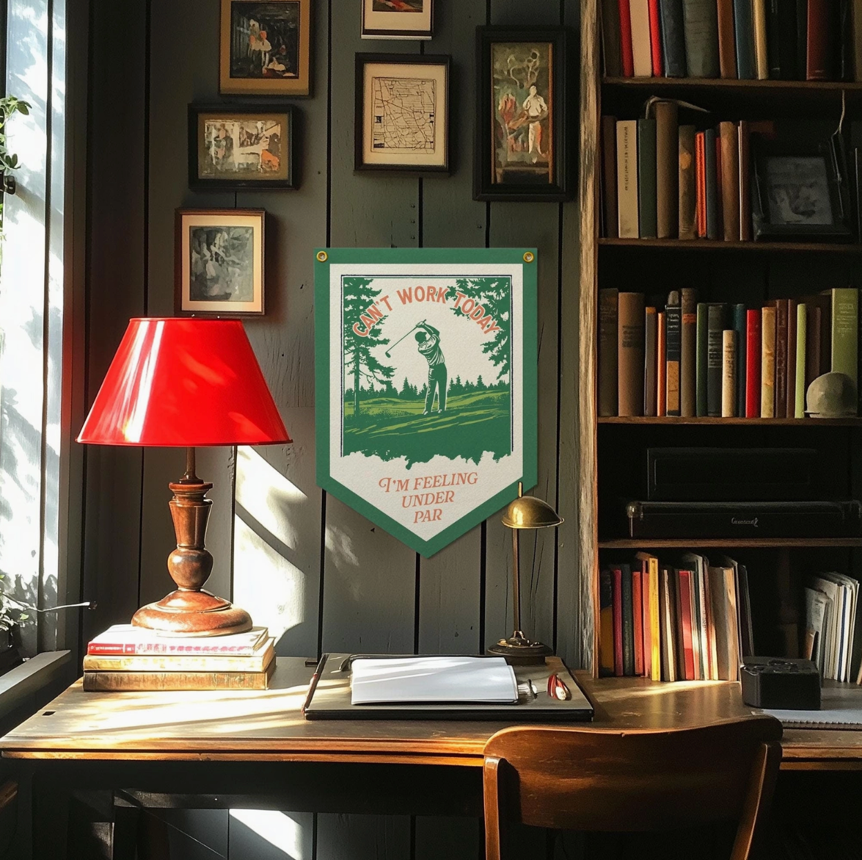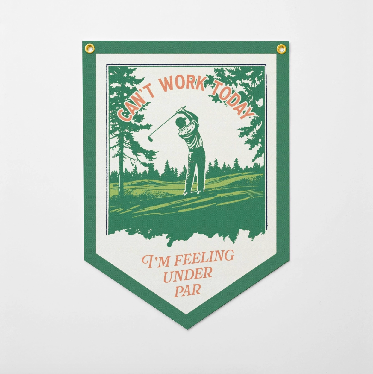 Call out of work and go Golfing with this vintage style "Can't Work Today I'm Feeling Under Par" felt camp flag! The perfect funny gift for those loved ones who are always Gone Golfing.