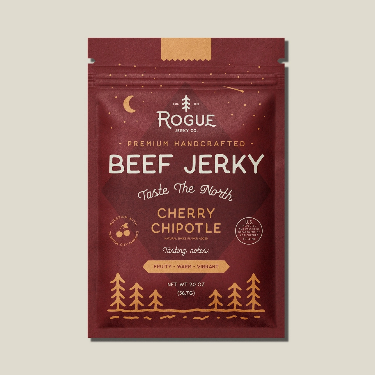 This Cherry Chipotle Beef Jerky bursts with the flavor of Traverse City cherries, perfectly balanced by the smoldering heat of chipotle. This handcrafted beef jerky is a tribute to Northern Michigan—sweet, spicy, and unmistakably Rogue. It’s a bold, gourmet snack that stands out on the shelf and delivers an elevated experience beyond ordinary jerky.