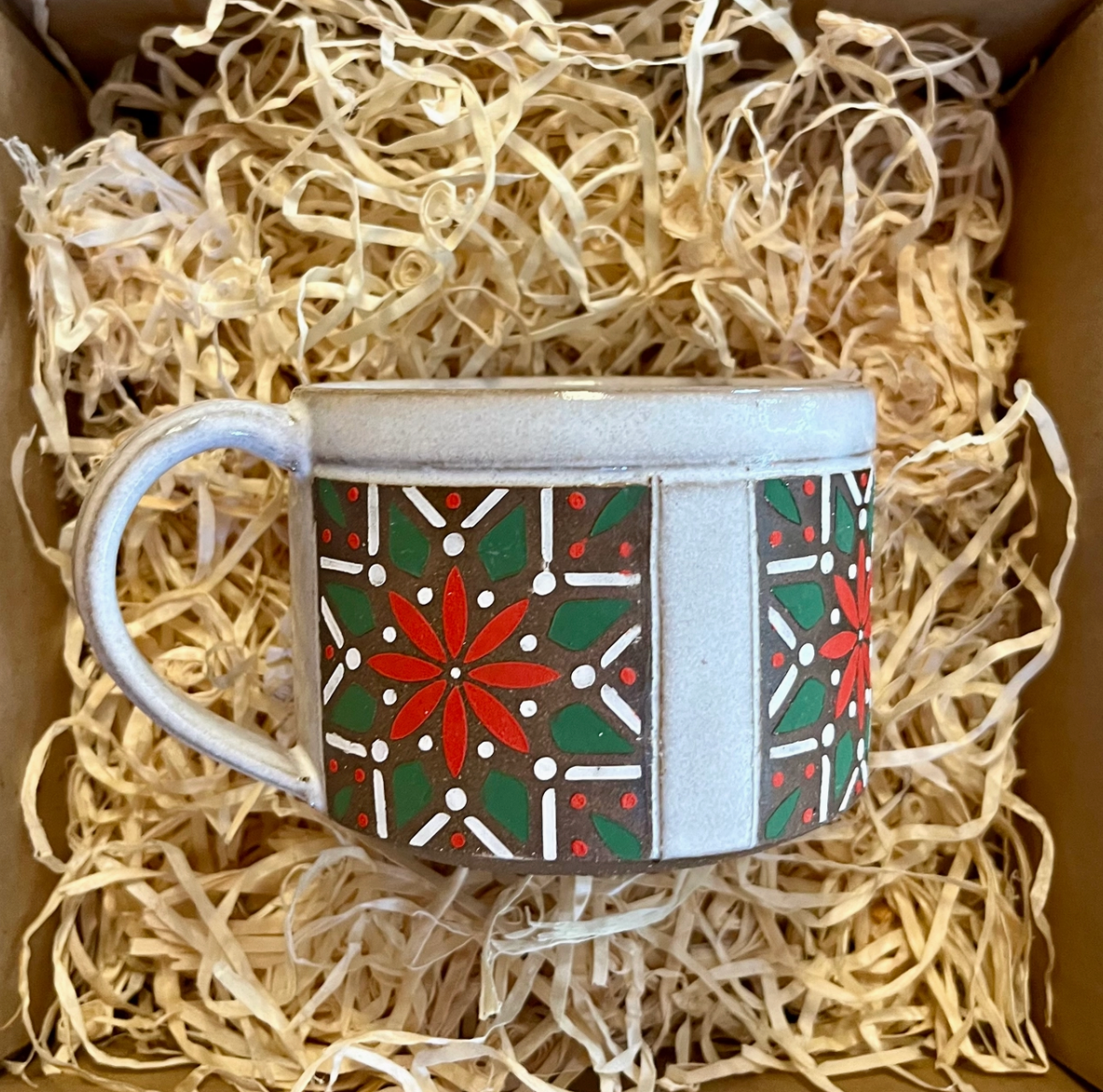Introducing the "Christmas Comfort" mug, a beautifully handcrafted stoneware piece that embodies warmth and charm. Featuring a unique quilt block exterior, this mug showcases a holiday edition quilted pattern. The striking white glazed handle and liner provide a delightful contrast to the red, green, and white patterned exterior. Each mug is meticulously handmade and wheel-thrown in Vermont, ensuring that every piece is one-of-a-kind. Perfect for enjoying your favorite holiday beverages.