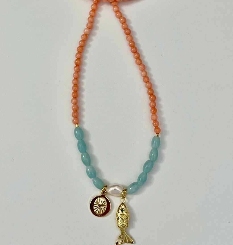 The Cora Necklace features Bamboo Coral and Amazonite arranged in a balanced color block design, highlighted by a central pearl. It is adorned with two delicate charms: a tiny medallion and an articulated fish with a striking green eye!