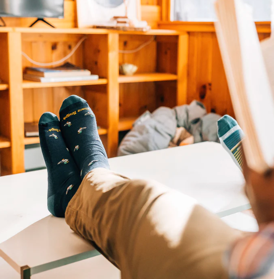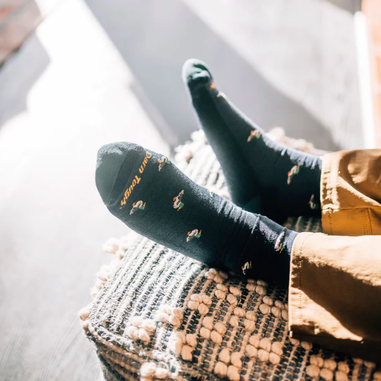 If you've ever crossed paths with a moose- you'd remember. Our Duck Duck Moose sock comes from a Vermont take on the classic duck-duck-goose game. Only in our version, if you see a moose you run away, not in a circle. Thankfully, the Merino Wool knit and durable construction of these best fitting socks will have you outrunning moose most of the time. Classic crew height of a men's dress sock with cushion under foot for added waddling comfort.