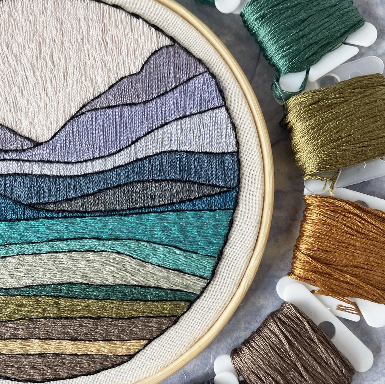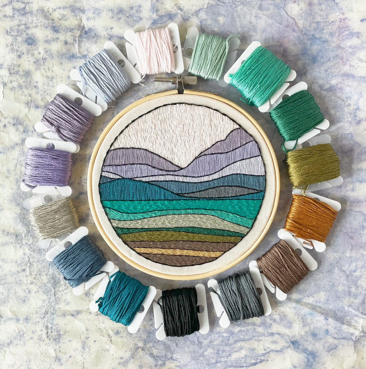 Enjoy completing this beginner-friendly 5” embroidery kit with 15 DMC colors of a relaxing mountain and lake scene, inspired by banff national park. The instructions assume someone is a complete beginner and include step by step tutorials and links to videos on how to do the stitches for this pattern: couching, satin, split, and stem stitch. Once you learn the stitch type, simply "color in" with stitches the sections on the pre-printed fabric according to the color guide.