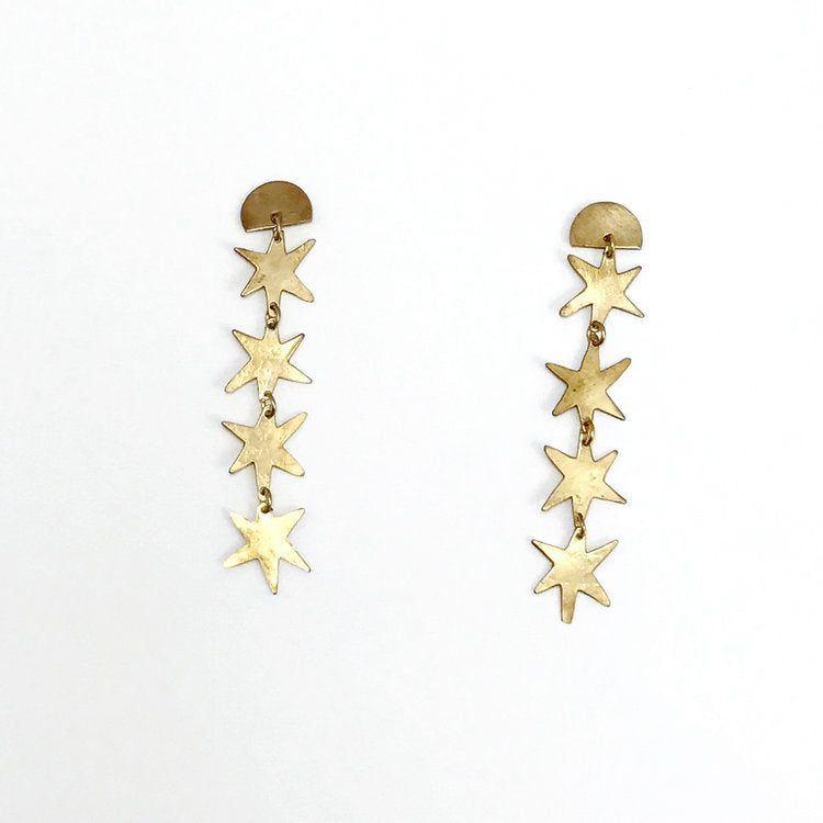 Hand hammered brass half moons holding dangling stars. Brass, with sterling posts. Made by hand in Oakland, CA.