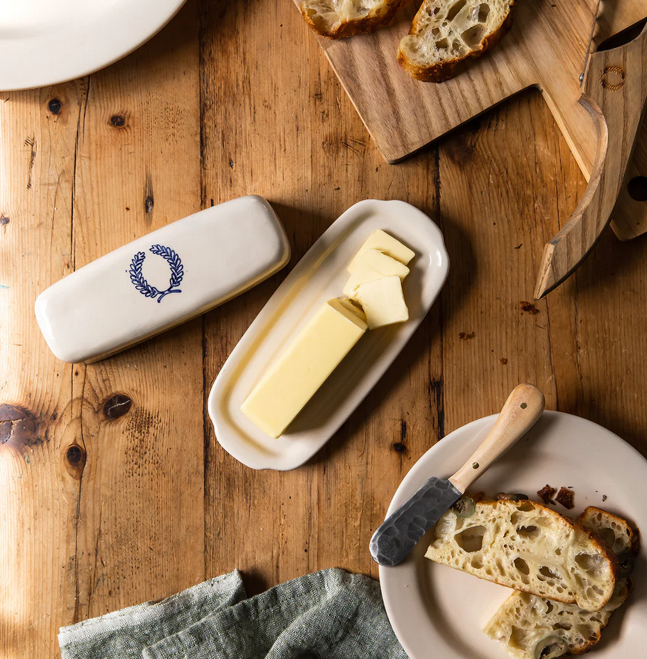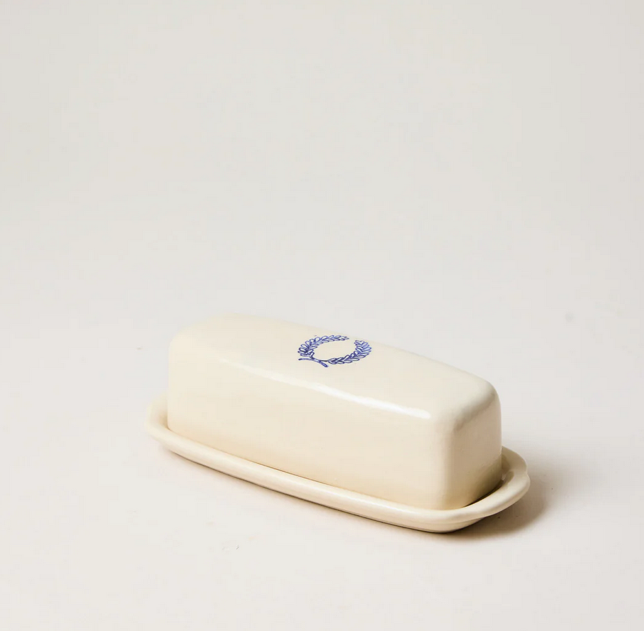 A timeless staple designed for daily use, this stoneware butter dish brings function and charm to your table. Made in a small-town Ohio studio and hand-finished with a laurel stamp, it fits a standard stick of butter beneath its smooth, curved lid. The sturdy form and classic shape make it easy to reach for—whether softening for spreading or serving at supper. Built to last and made to be used, it's an heirloom piece you'll reach for every day.