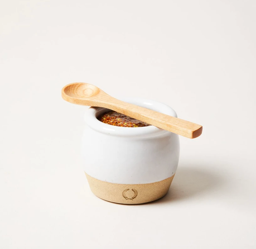 Delight your guests with Farmhouse Pottery's wheel thrown pickle pots, featuring a rounded design, 3/4 glaze dip, and hand carved wooden accessories. Serve pickles or other small snacks in this pickle jar, as well as mustard or other sauces. Wooden spoon hand carved in Maine.