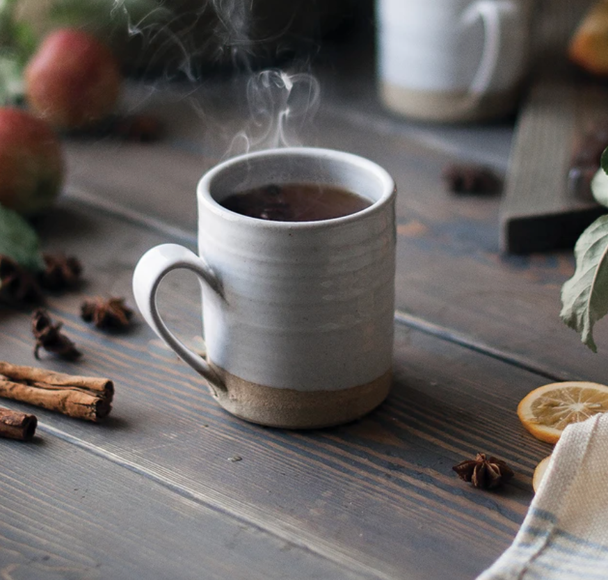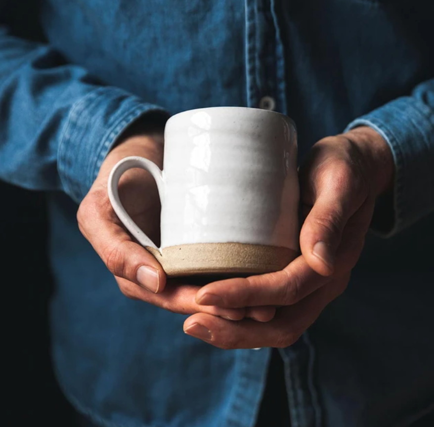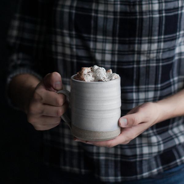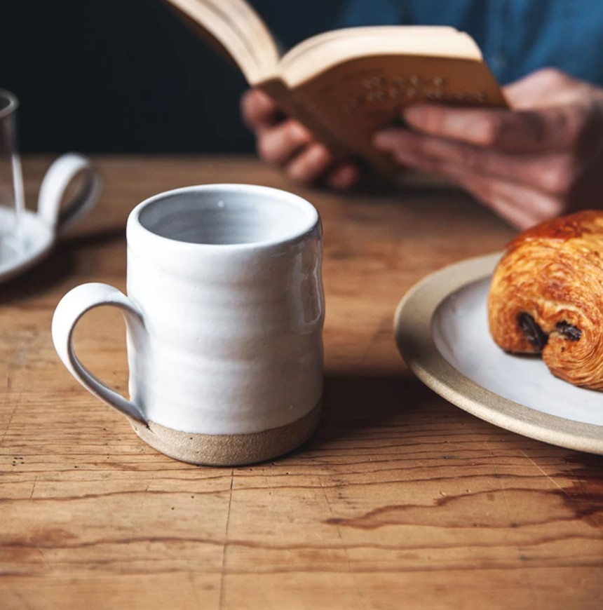 Honest and simple, you will be thinking about this mug when you wake and anticipate your morning brew. Made for comfort moments and pondering thoughts, this mug is good to have in hand any time. Made of oven, dishwasher, and microwave safe durable American stoneware.