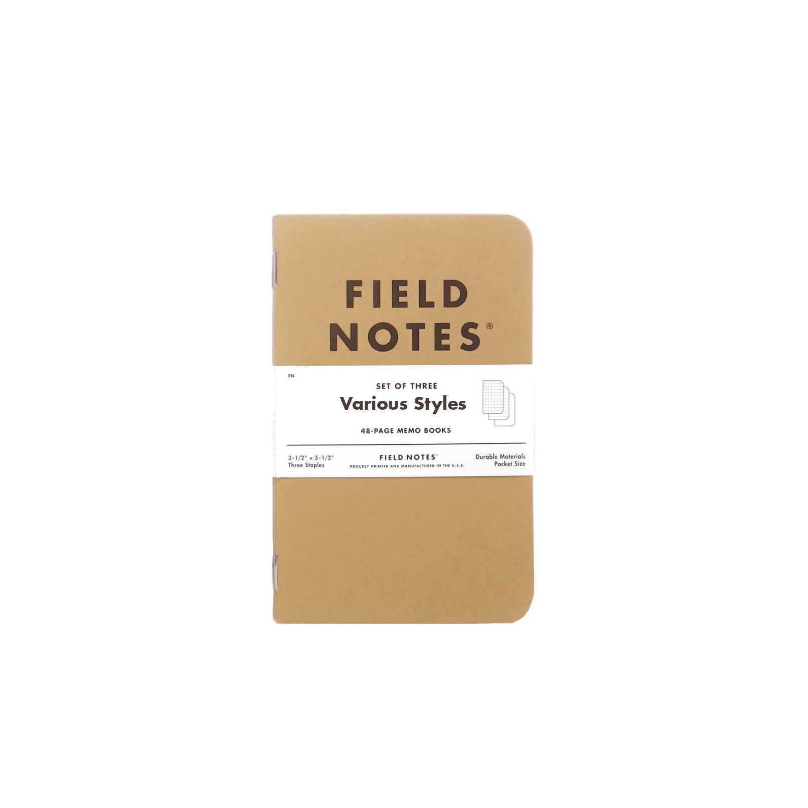 The classic Field Notes 3 pack. To make a long story short: when Aaron Draplin made the very first Field Notes by hand, as a holiday gift for friends, they looked pretty much like these notebooks. Field Notes started the company with one item, a 3-Pack of Kraft Memo Books with graph paper inside.