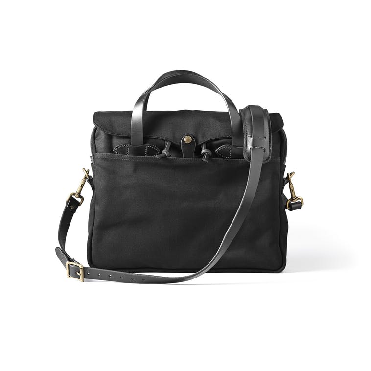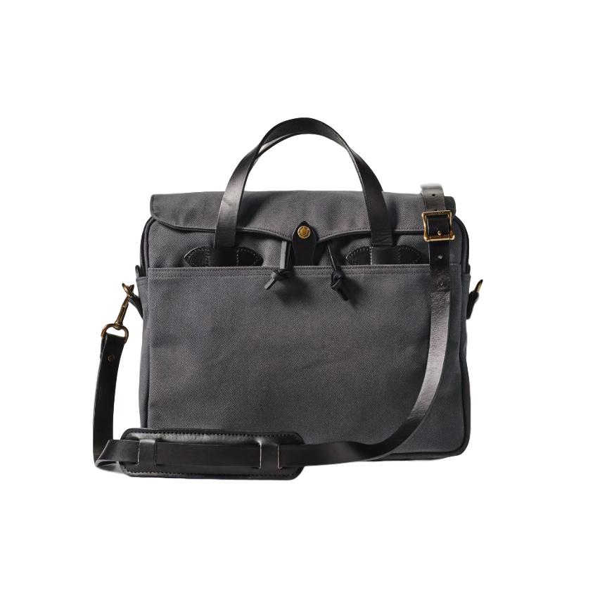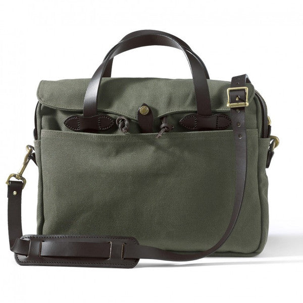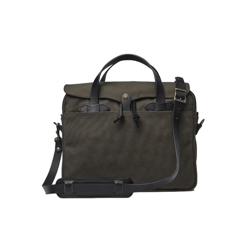 This legendary briefcase is built with Filson's signature Rugged Twill, an industrial-strength fabric that resists water and wear, and features saddle-grade Bridle Leather handles, strap and accents. It has a large interior compartment with dividers plus slotted pockets for small item organization.
