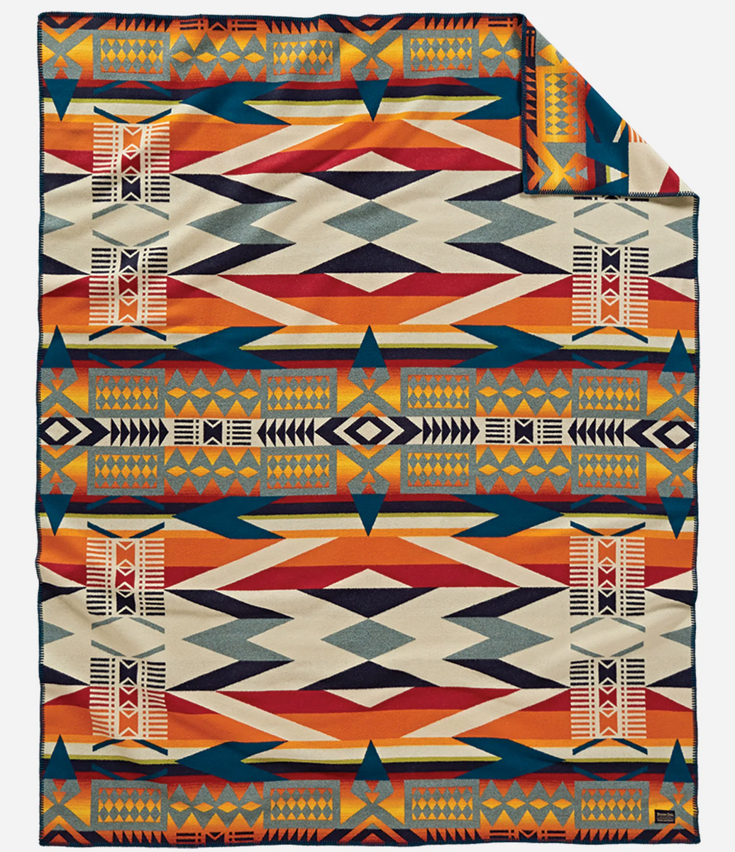 A made-in-America wool blanket in a dazzling geo pattern. It's based on a Native American legend that says a hero disguised himself as a rabbit to capture fire for his people, a victory honored in this vivid design. Reverses to pattern's opposite.
