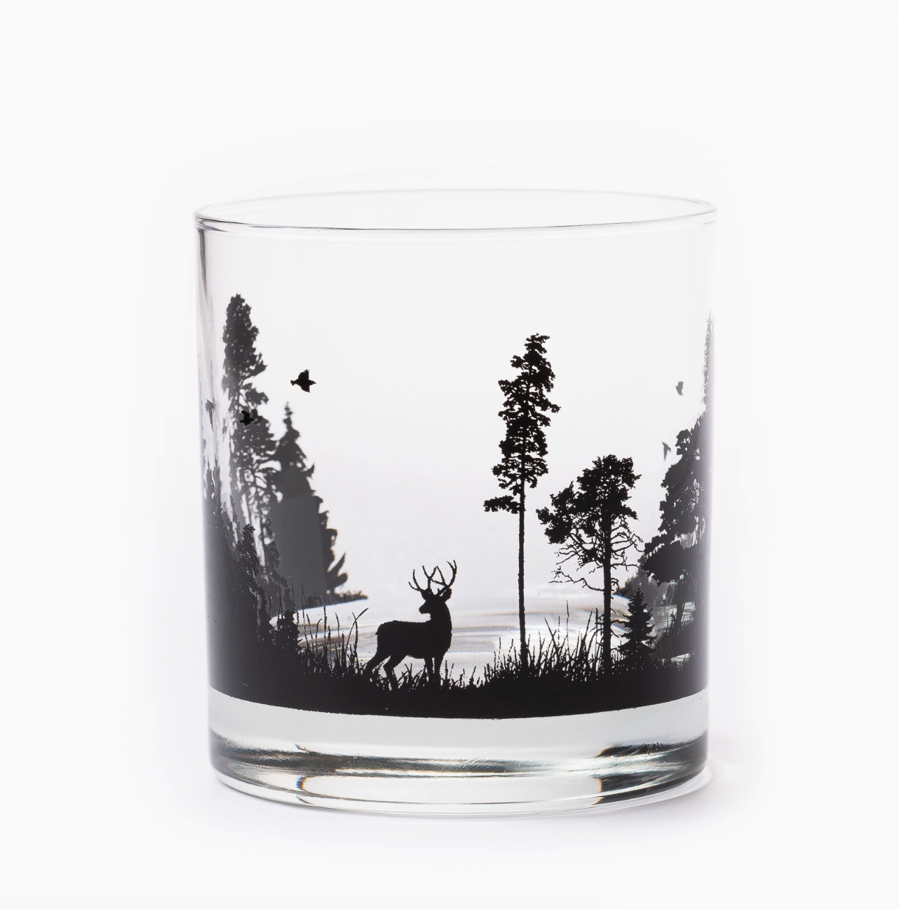 This rock Glass features an original illustration showcasing a forest scene complete with a deer, fox and birds throughout the print. A great gift for anyone who enjoys the great outdoors. This print wraps 4/5's of the entire glass. Manufactured in the US and printed by hand in a Colorado shop.
