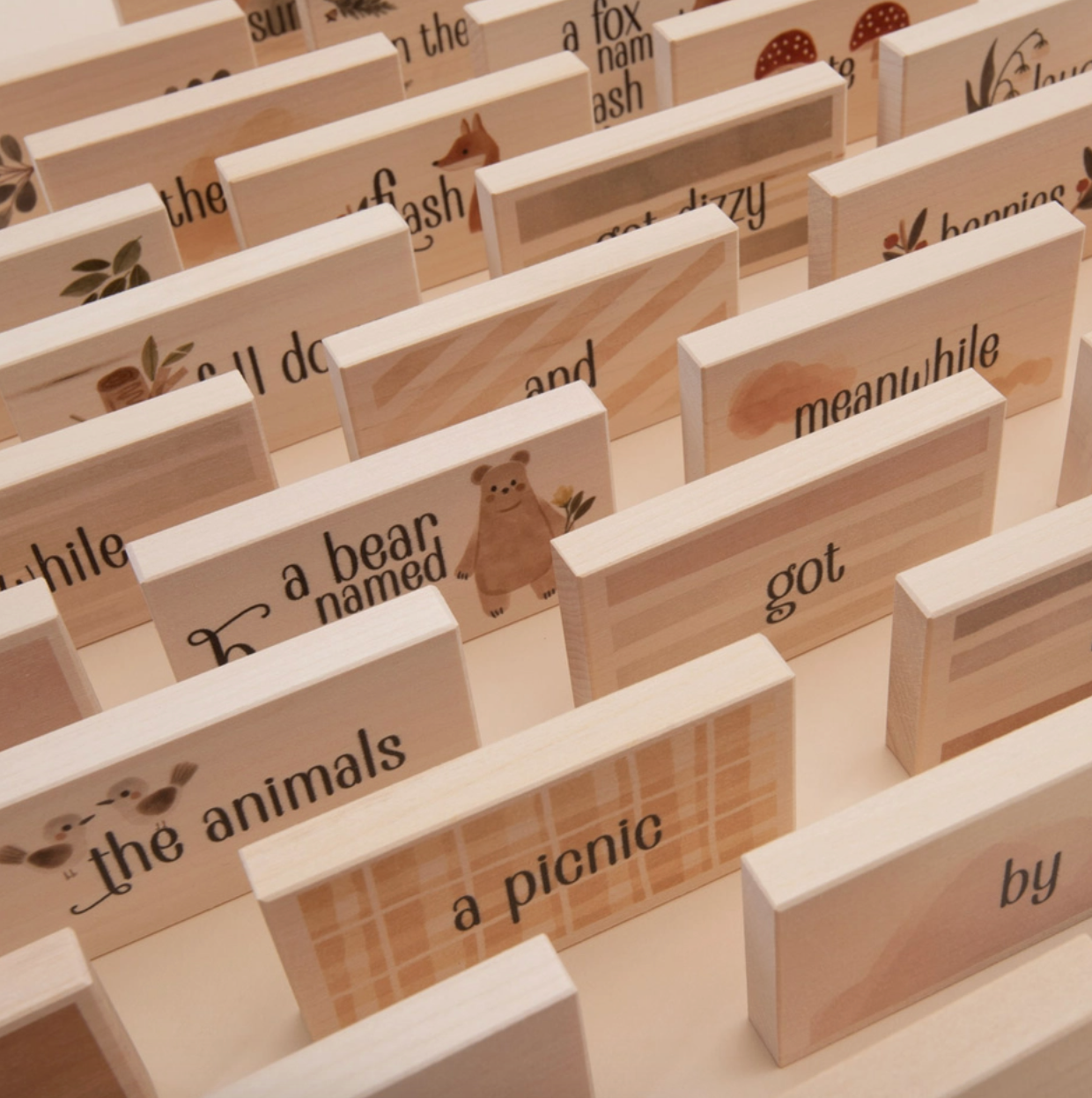 Create hundreds of stories! Both sides of each chip feature words and illustrations. Piece together tales of forest adventures with Daphne the Deer, Burp the Bear, and Flash the Fox. Let your imagination go wild! Will the forest creatures enjoy a picnic with berries and honey? Or will they run from foul smells and buzzing bees? It’s up to you to craft your own woodland fables.