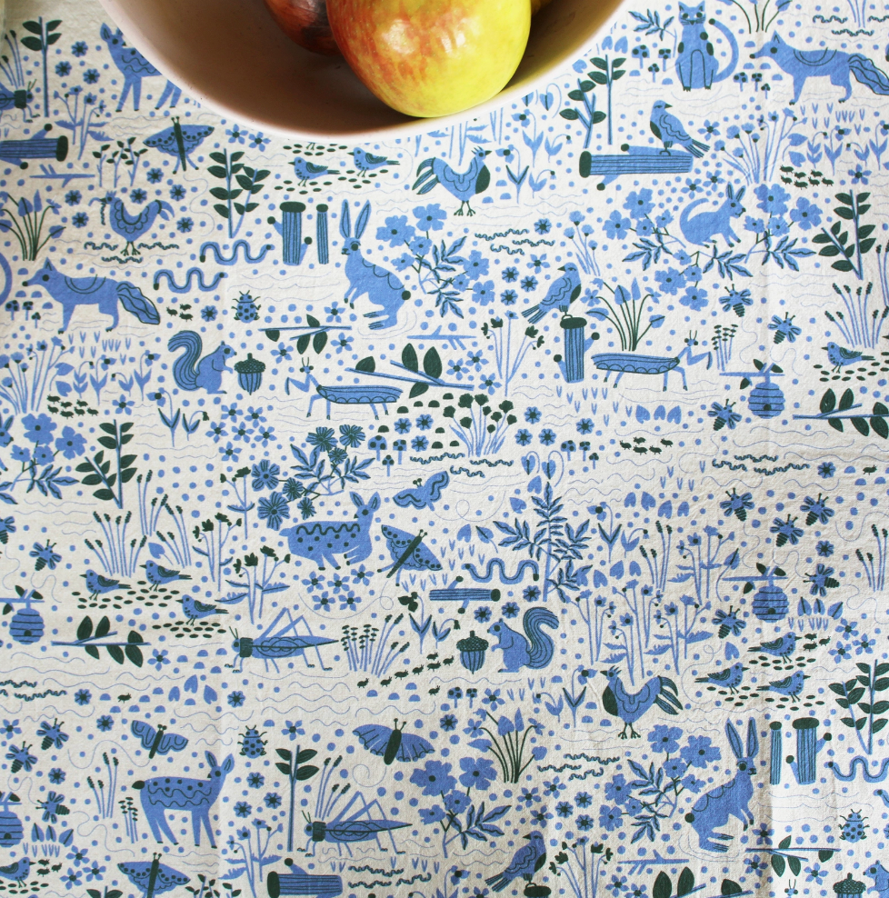 This is a flour sack tea towel featuring Leah's "Garden Friends" design with flowers, bugs, and lots of animal creatures. It features colors of periwinkle blue and dark hunter green on a creamy off white background. Pretty enough to hang on your wall or display in your kitchen.