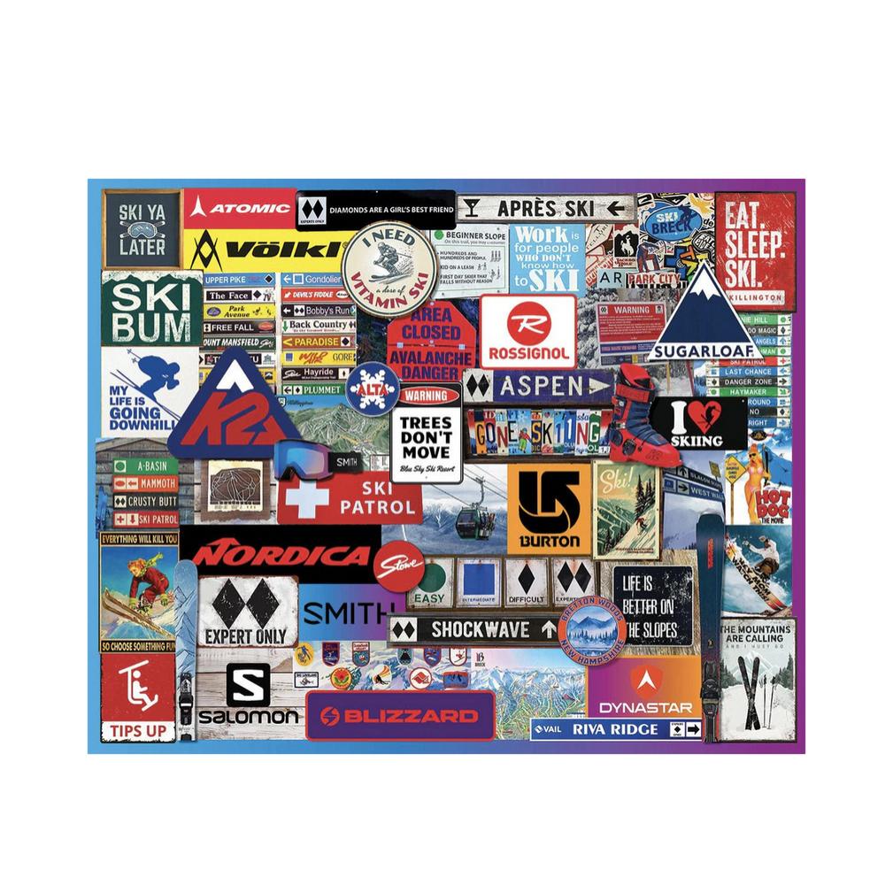 2071 Gone Skiing. Popular brands, runs, and sayings have been included in this collage style 1000 piece jigsaw puzzle created by artist Doug Banks.