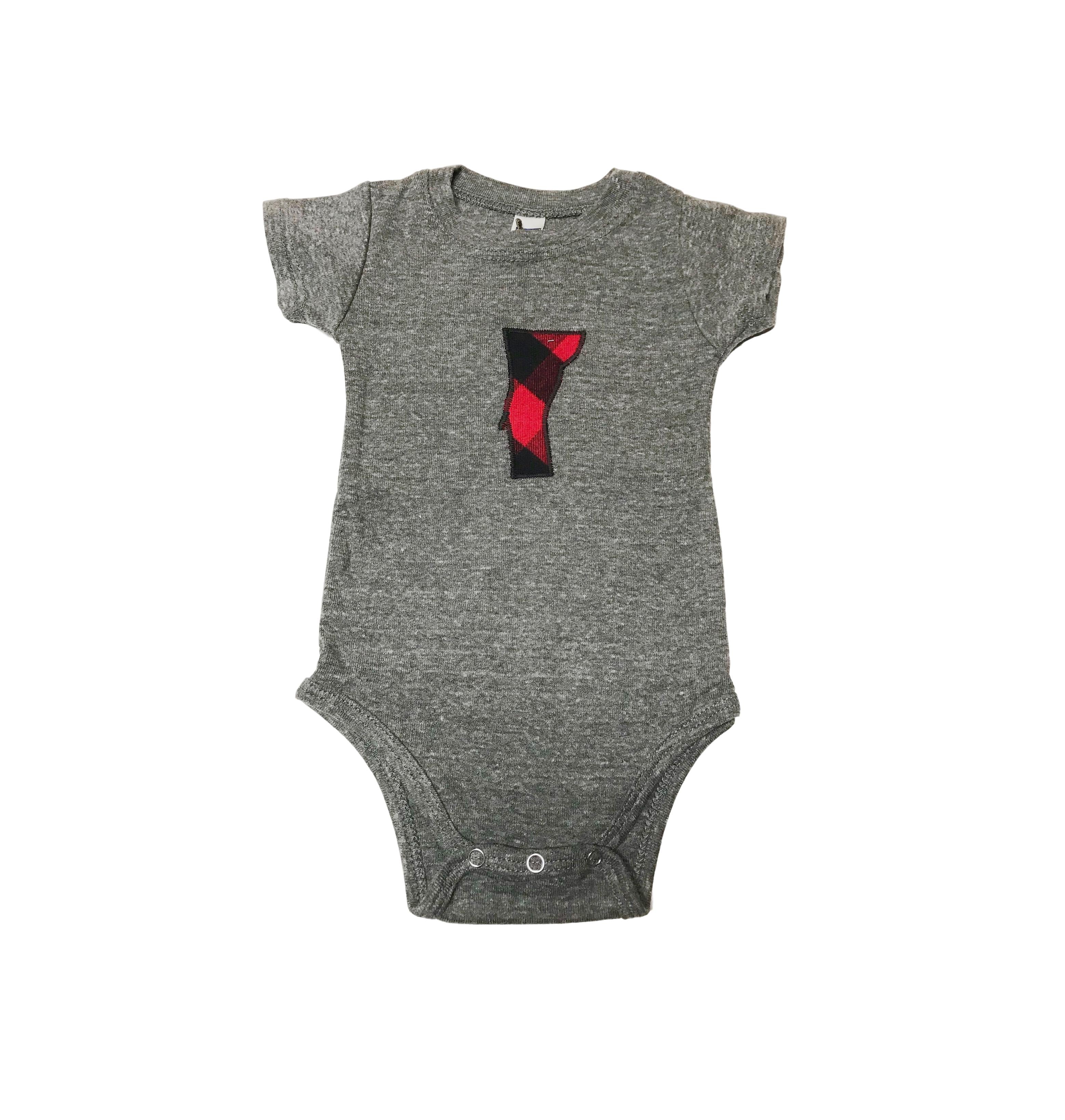 Who wouldn't want to tote their tot in a cute bodysuit that will let the world know to which state they belong? Each American made bodysuit comes in a heathered gray, vintage style cotton blend and features a red and black buffalo check flannel Vermont securely sewn onto the chest portion of the bodysuit, just a few inches below the neckline.