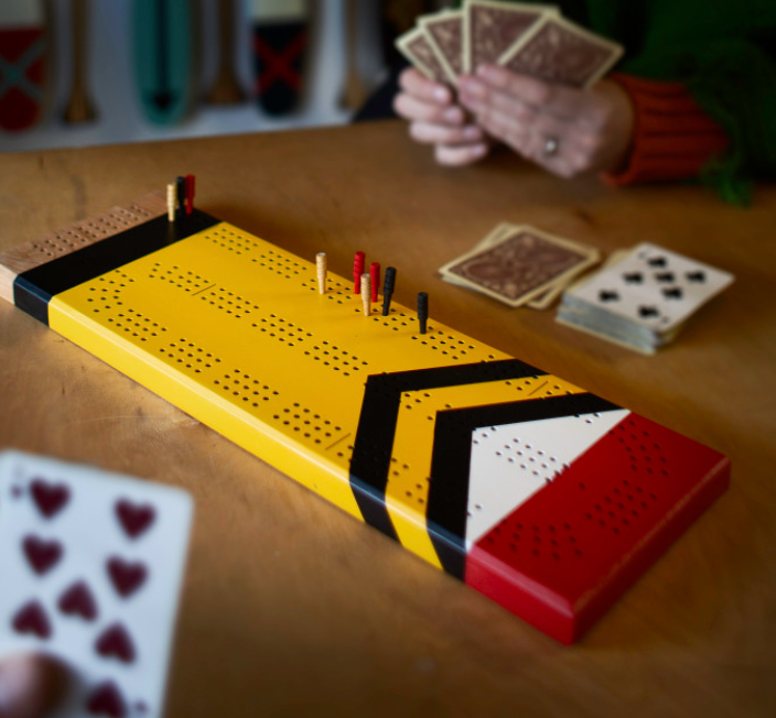 Bright and punchy, the West painted cribbage boards offer an eye-catching way to play a round of cribbage. Perfect for the home or cabin, this cribbage board is made in Minnesota from premium Cherry wood. Has a compartment cut into the back of the board with a magnetic lid to store the included pegs. Carefully handpainted, this is a great gift for a friend or a fixture at your late-night card games. Just supply your favorite deck of cards, and you're ready to play!