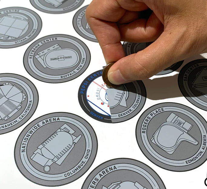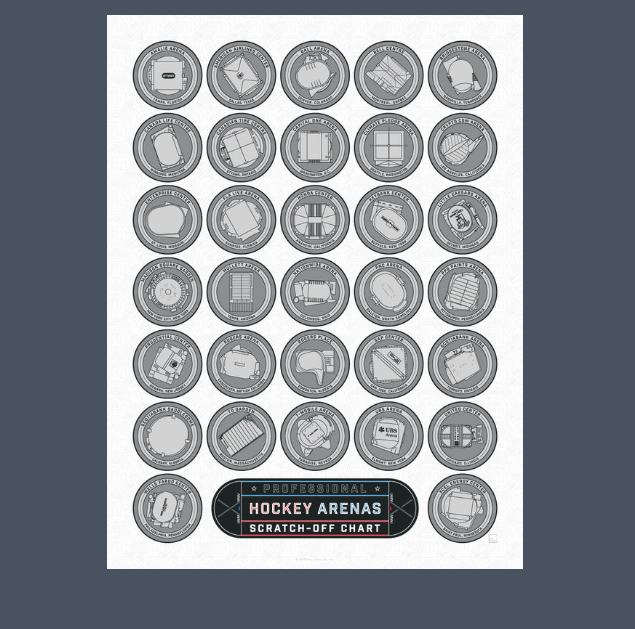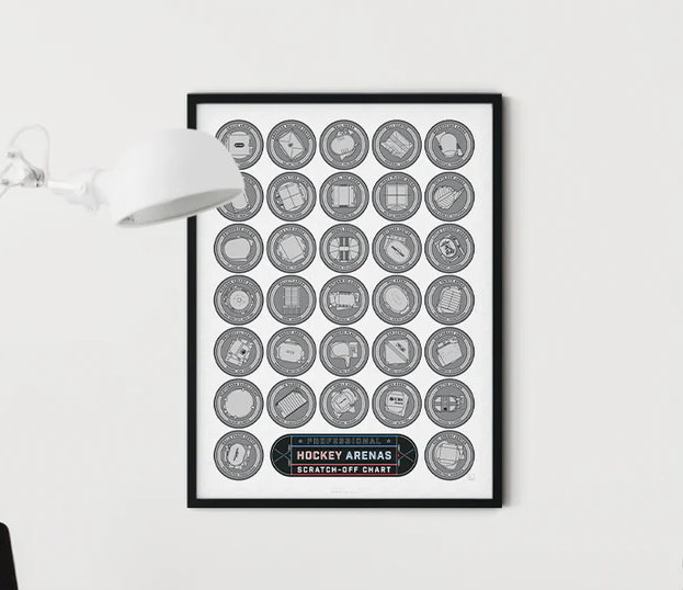 Check yourself into rinks across the country with this scratch-off chart of pro hockey arenas! Simply scratch away the silvery aerial view from each hockey-house you attend to reveal a full-color close-up of center ice underneath. You miss 100% of the prints you don’t buy, so don’t miss out on this Great One.