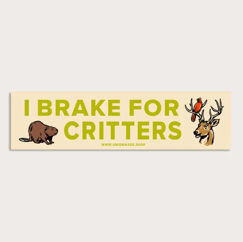 "I Brake for Critters" bumper sticker is perfect for animal lovers! Made from high-quality, glossy-coated vinyl, it’s built to handle the road and whatever weather comes your way. Measuring 9.5" x 2.5", this sticker features a friendly beaver, deer, and cardinal—a fun reminder to watch out for wildlife while you're out and about.
