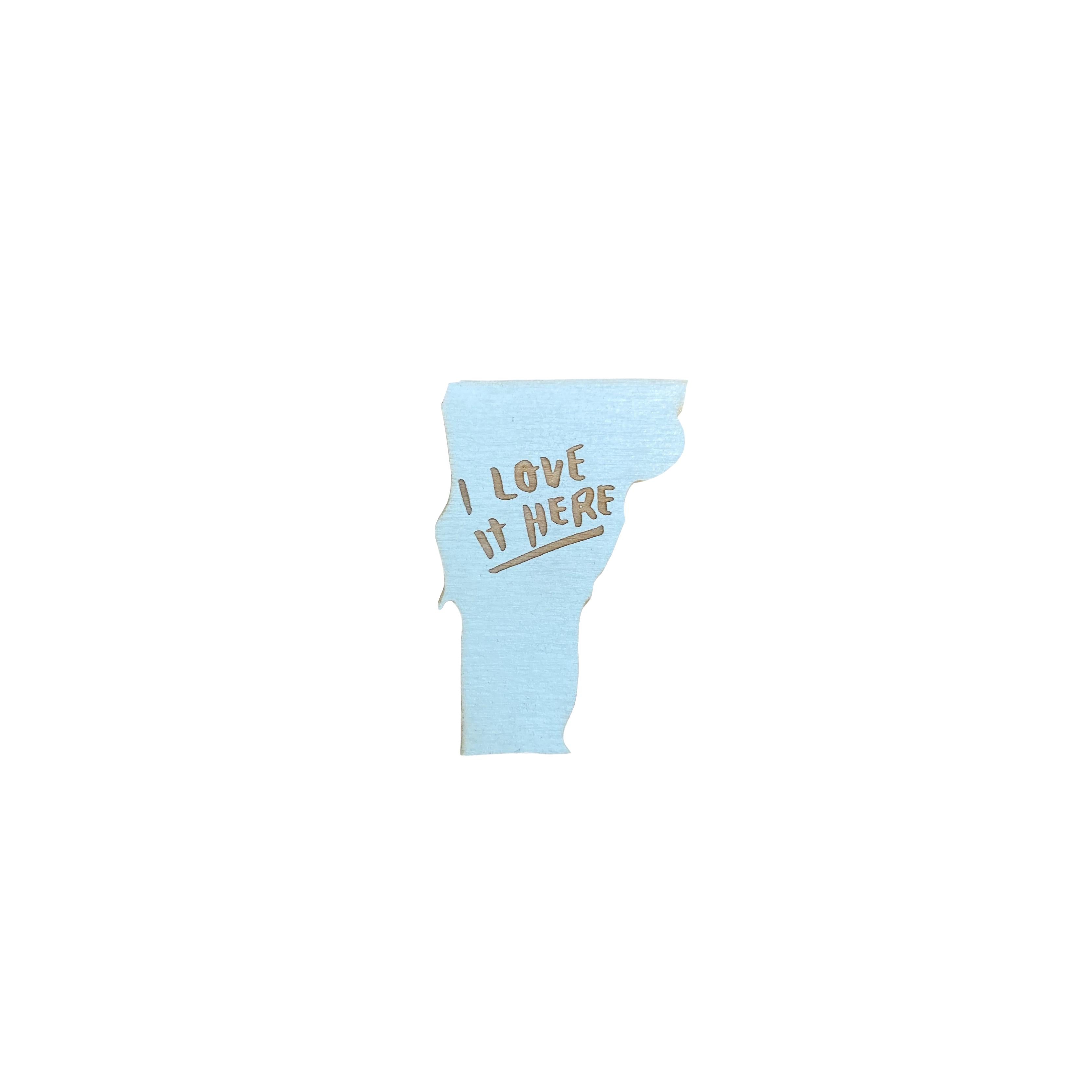 Laser-cut wooden magnet in the shape of Vermont engraved with the words 'I Love it Here' in signature handwritten font.