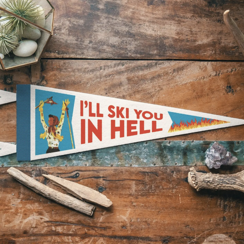 I'll ski just about anywhere but, cut me in the lift line and I'll Ski you in Hell! Celebrate your love of skiing and your snarky sense of humor with this vintage sports-inspired pennant. Add a little whimsy & sense of adventure to any room, with a handmade felt banner! These pennants are made of one solid piece of fabric. The designs are printed directly onto felt, one at a time at a small shop in Maine, USA.