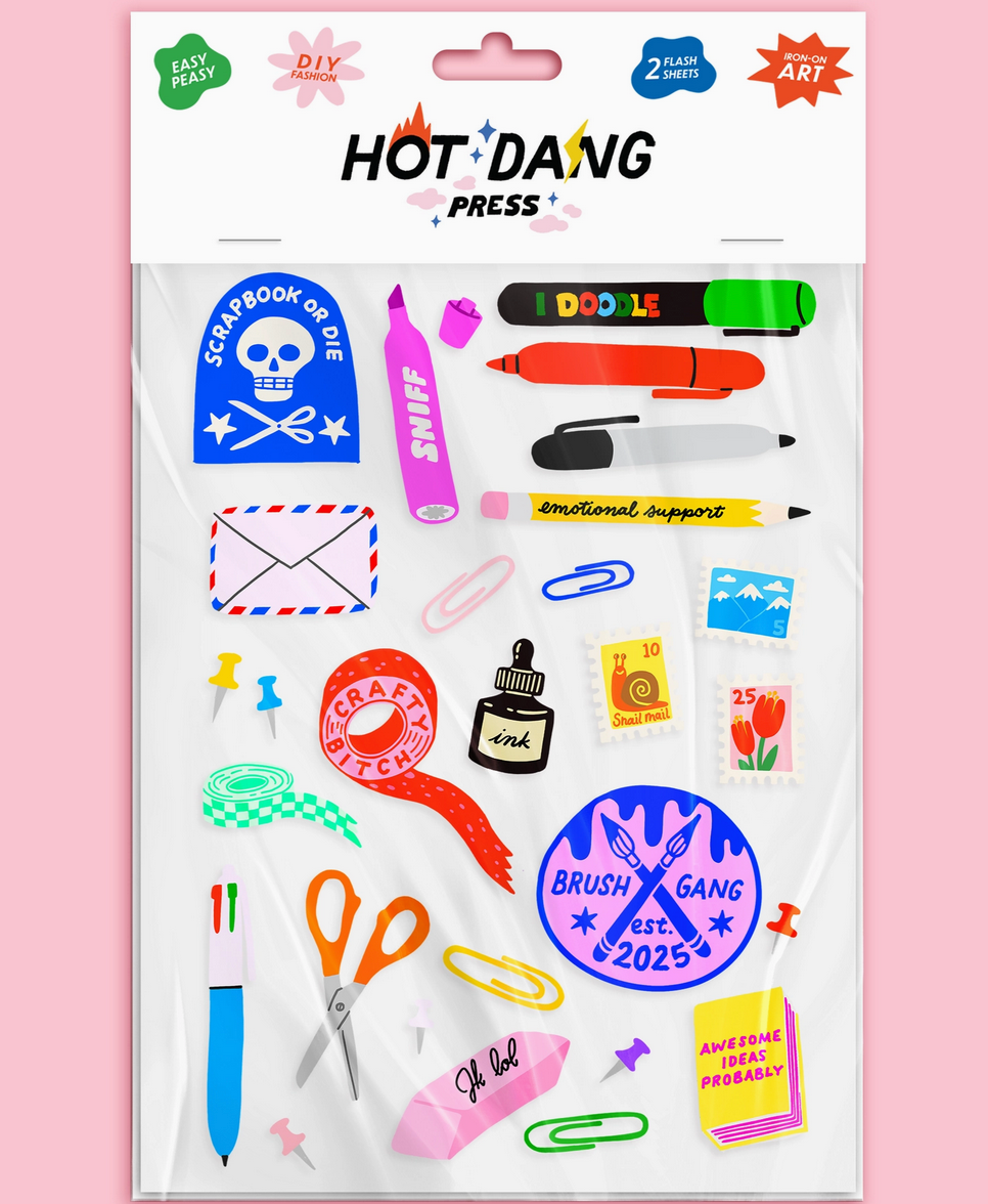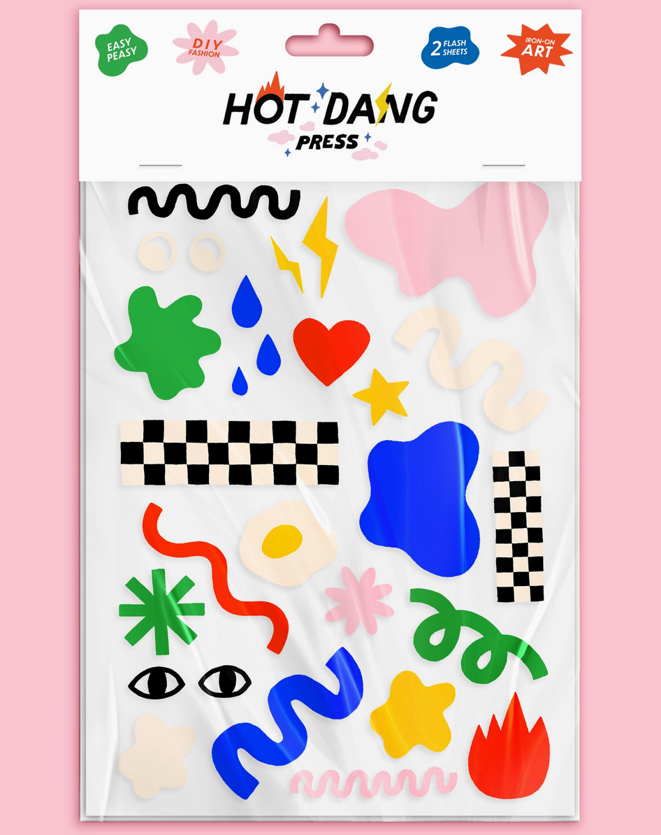 Each set includes two sheets of the displayed illustrations, heat protective parchment paper for application, and easy peasy instructions. You bring the heat! All you need is an iron.