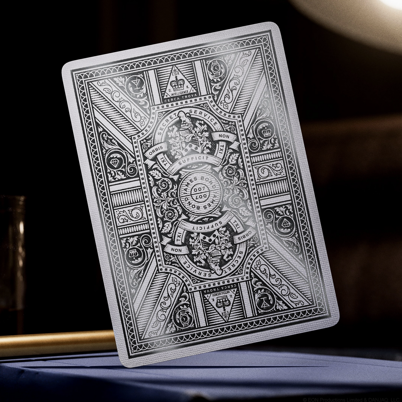 The finest, opulent silver foil with tactile embossing on each box. Striking gunmetal silver foil on every card within. Featuring completely custom artwork in every aspect of the design, with the Ace of Spades, Joker, box design, and court cards inspired by iconic Bond films, gadgets, and weapons over the past six decades.