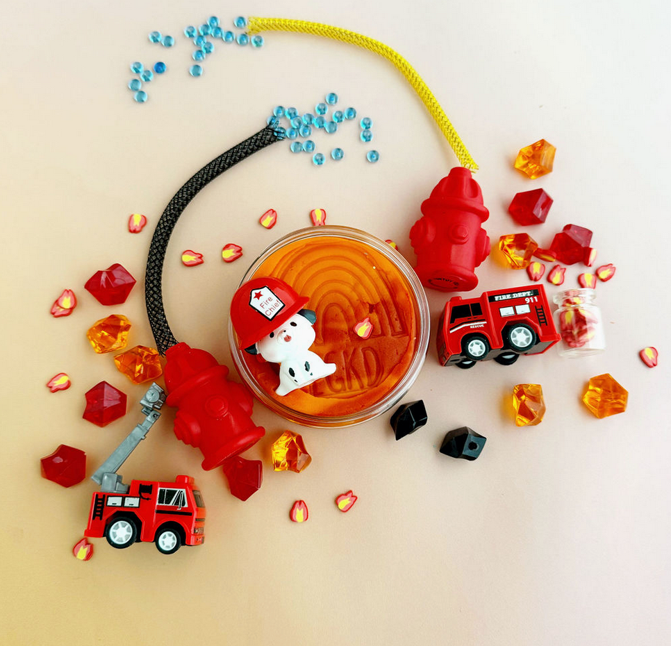 Includes: 8 oz Red and Orange Marbled (Cherry Mango) KidDough, 2 Jars of Mix Ins (Fire and Water Beads), Dalmatian Puppy, Fire Hydrant, Red and Orange Acrylics.