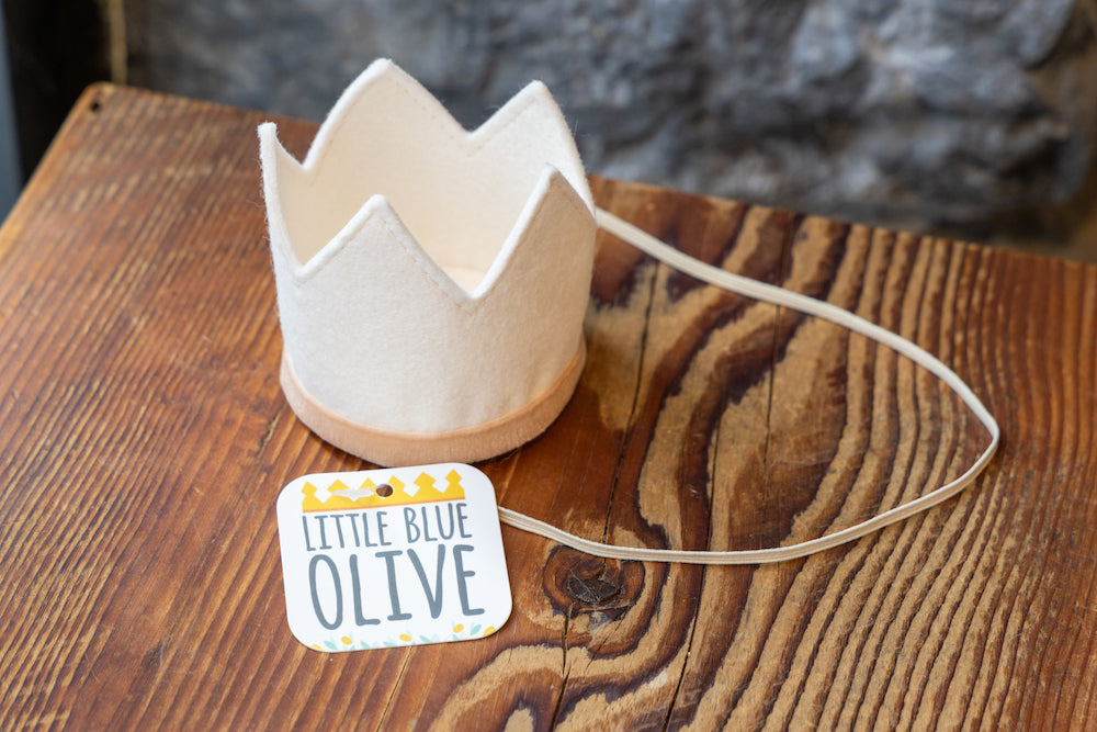 This Linen Felt Crown with Beige Velvet Trim Crown is attached to a comfortable elastic and meant to be worn around the back of the head, behind the ears. Tilt to the side for a fun, whimsical look! The perfect accessory for birthday celebrations, memorable photo shoots and every day fun for dress up. Crown has a base to provide stability that holds a round shape.