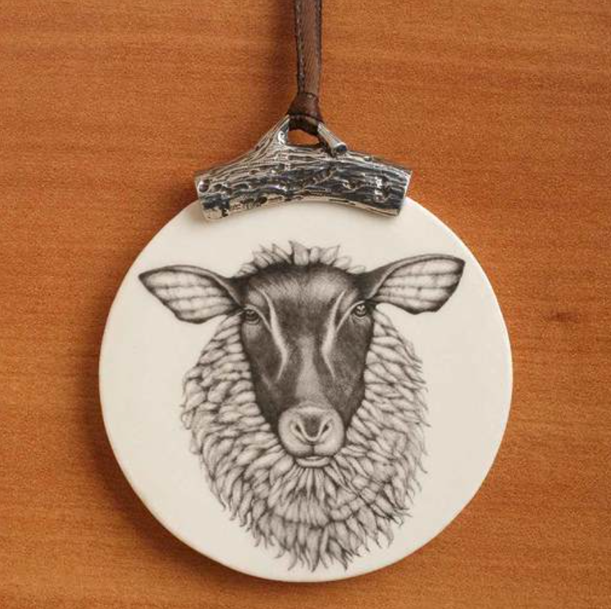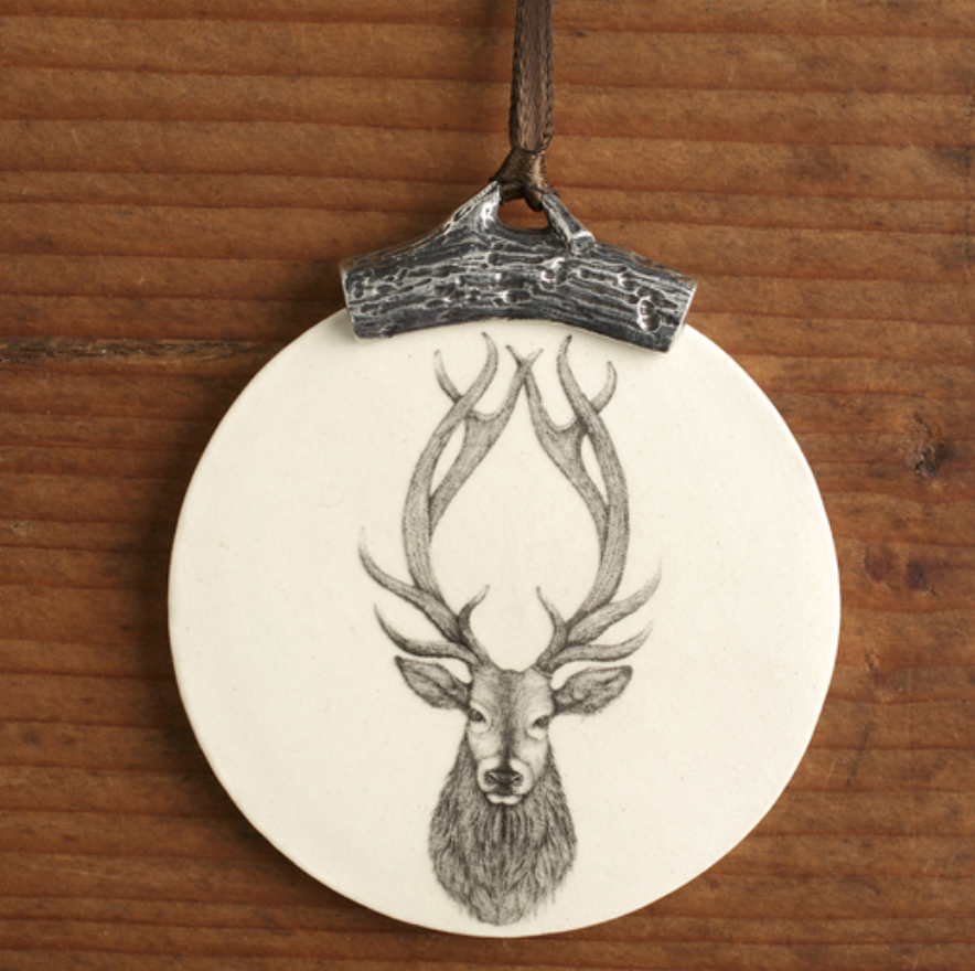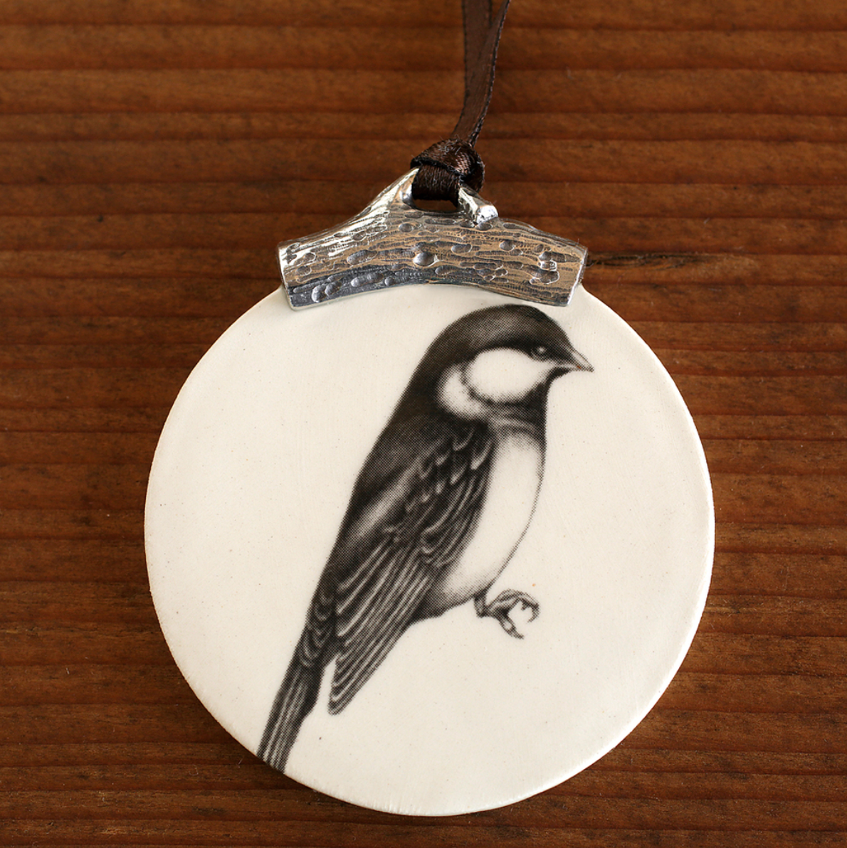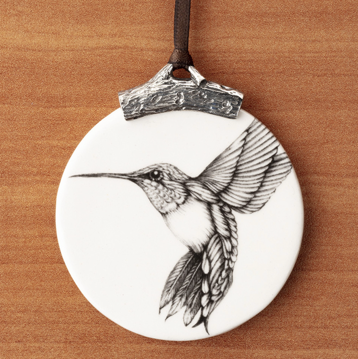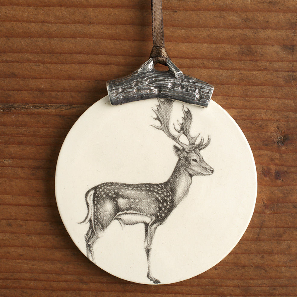 Each ornament is carefully constructed from earthenware and hand-glazed with non-toxic glazes The lead-free pewter branch at the top of each ornament is made by Danforth Pewter in Middlebury, Vermont.
