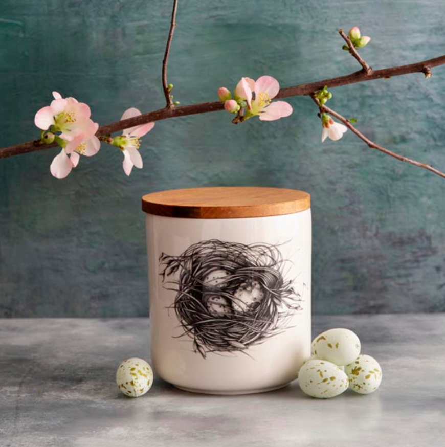 These handmade canisters are stylish storage for every room in your home. Each canister is crafted from earthenware, brushed with hand mixed glazes and finished with Laura’s signature illustrations. Locally sourced Maple Wood lids with an artisan finish seal to keep your pantry items fresh.A