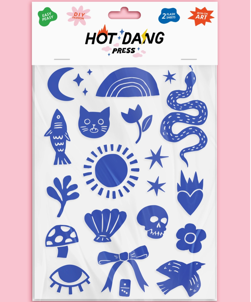 Single color sheets in a chic linocut illustration style. Iron-on art to customize and enhance your apparel, totes, hats, tea towels, bandanas, handkerchiefs, leather goods, and other treasures. Each set includes two sheets of the displayed illustrations, heat protective parchment paper for application, and easy peasy instructions. You bring the heat! All you need is an iron.