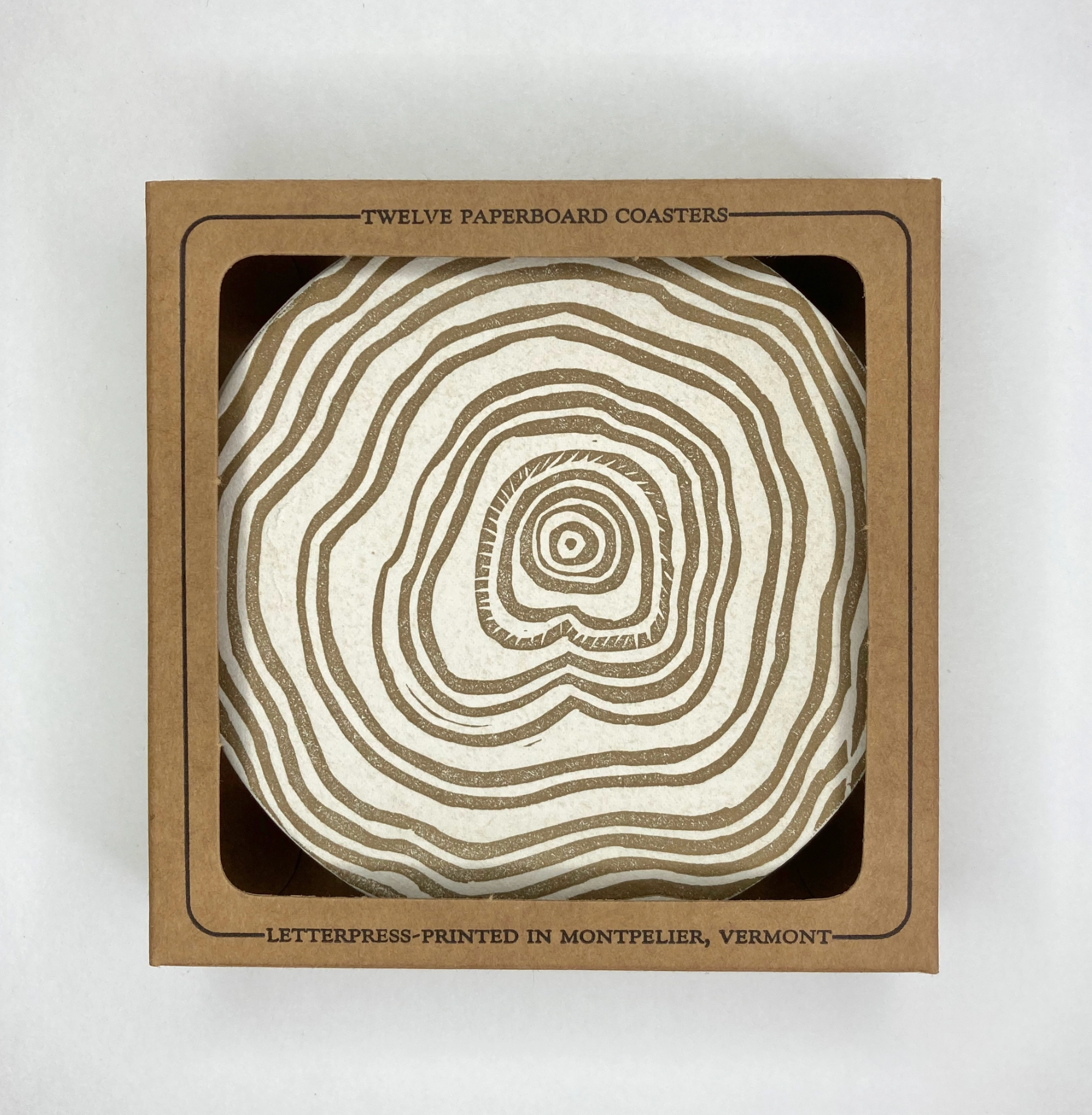 Inspired by the natural world, this coaster set features a hand-carved linoleum block of a tree cross-section. Printed in muddy gold ink, they have a subtle shimmer and can look anywhere from gold to brown, depending on the light!