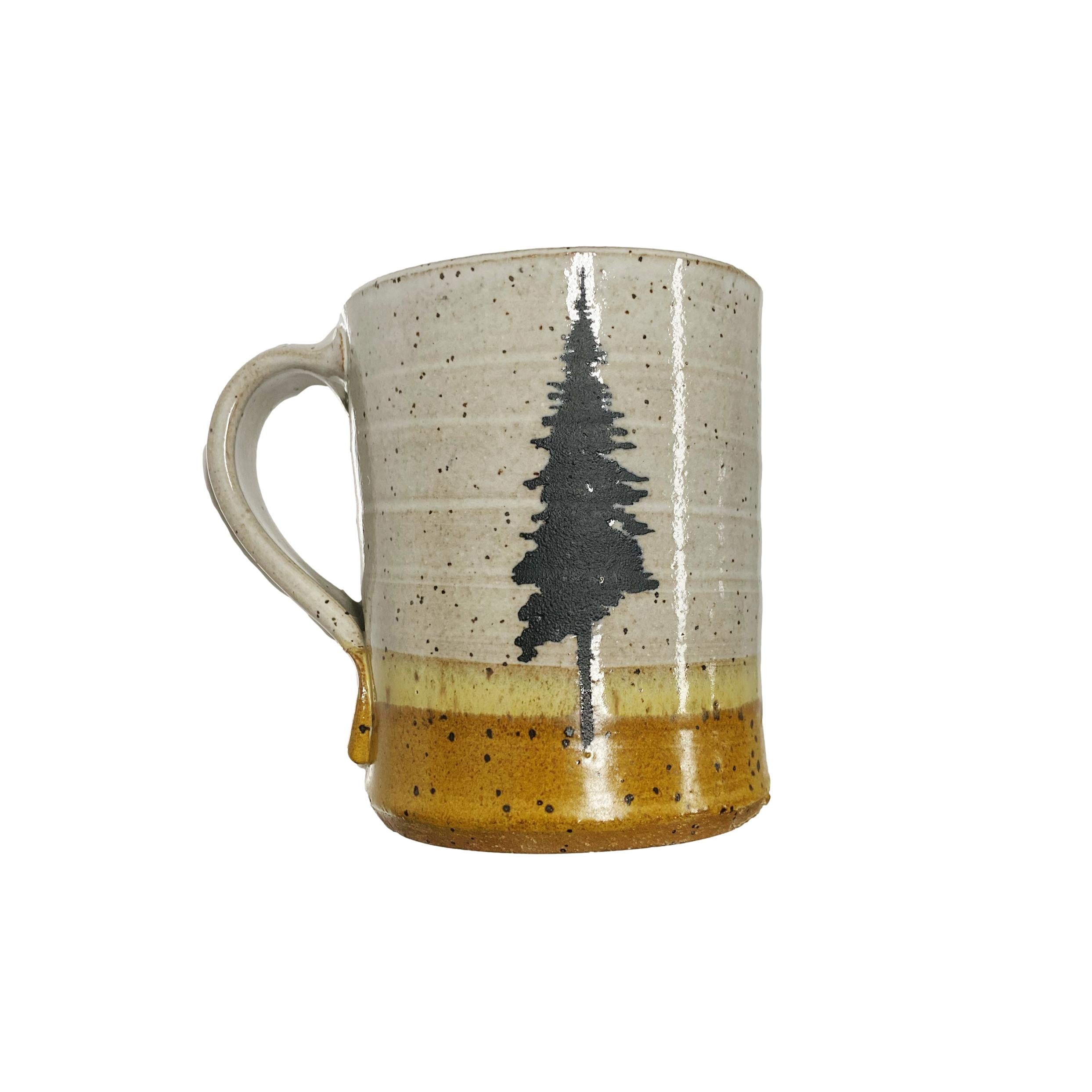 A speckled white glaze surrounds a lone pine tree. Reminiscent of loan straggler on the plains before the climb up the mountain. We blend a small layer underneath the tree and then finish the mug with a matte honey glaze to echo the landscape.