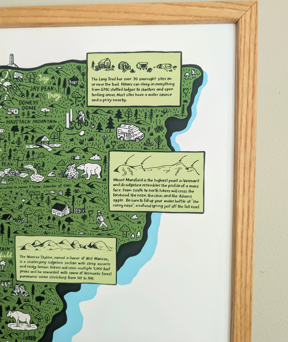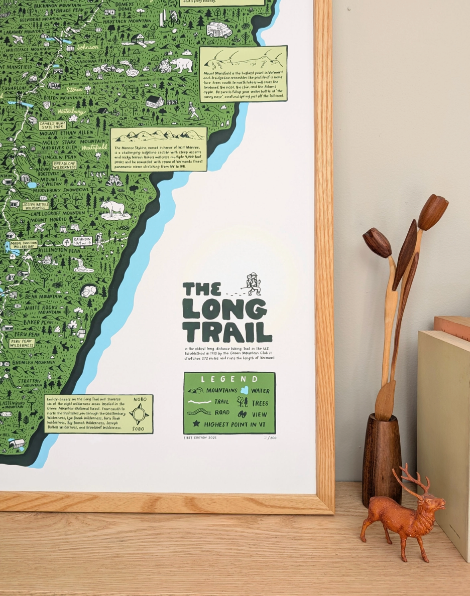 Hand printed 18x24 screenprint. This illustrated print by Brainstorm has all the best highlights the Long Trail has to offer. The Long Trail is the oldest long-distance hiking trail in the US. Established in 1910 by the Green Mountain Club it stretches 272 miles and runs the length of Vermont. Hikers doing the whole trail will pass through six of the eight wilderness areas, cross the Monroe Skyline, summit Mt Mansfield the highest point in Vermont, and spend many nights in one of the 70 established overnight sites on the trail.
