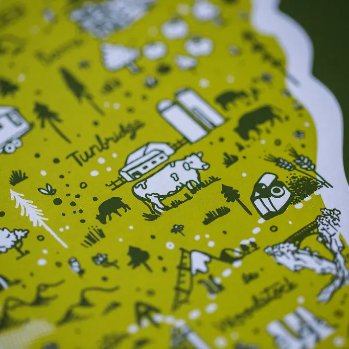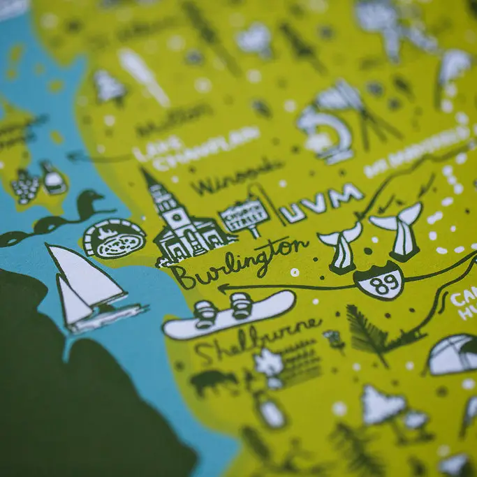 Hand printed 11x14 screenprint. This illustrated print by Brainstorm has all the best highlights the Long Trail has to offer. The Long Trail is the oldest long-distance hiking trail in the US. Established in 1910 by the Green Mountain Club it stretches 272 miles and runs the length of Vermont. Hikers doing the whole trail will pass through six of the eight wilderness areas, cross the Monroe Skyline, summit Mt Mansfield the highest point in Vermont, and spend many nights in one of the 70 established overnight sites on the trail.