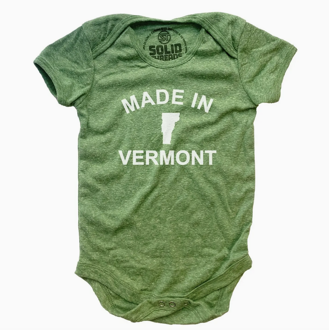 Vermont is all about locally sourced goods, and this super cool green state baby onesie, extends that ethos to the youngest of the human population in buttery soft style and comfort. Show your little one's true Vermont roots on many levels with this ethically sourced, USA Made graphic romper printed with eco friendly inks right here in Vermont.