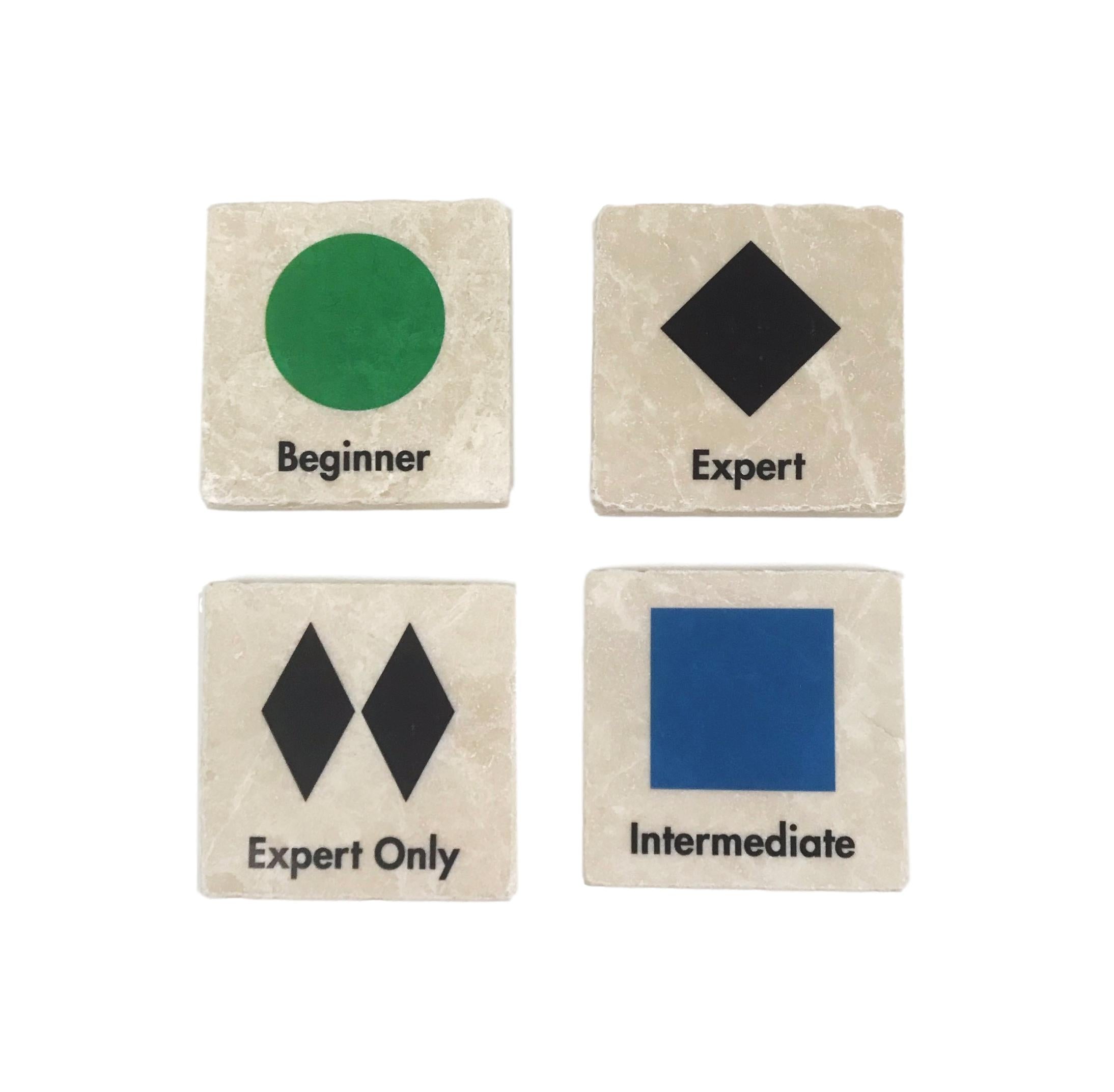 Bring the Ski Lodge vibe to your home with this set of 4 coasters, made for bunny hill beginners and black diamond destroyers alike. Each is painted with a different ski slope skill indicator. Here's a fun game-- subtly embarass your least favorite guest by giving them the green circle! Haha! That means they stink at skiing! Not you though. You're the two-plank expert-- you have the coasters to prove it.
