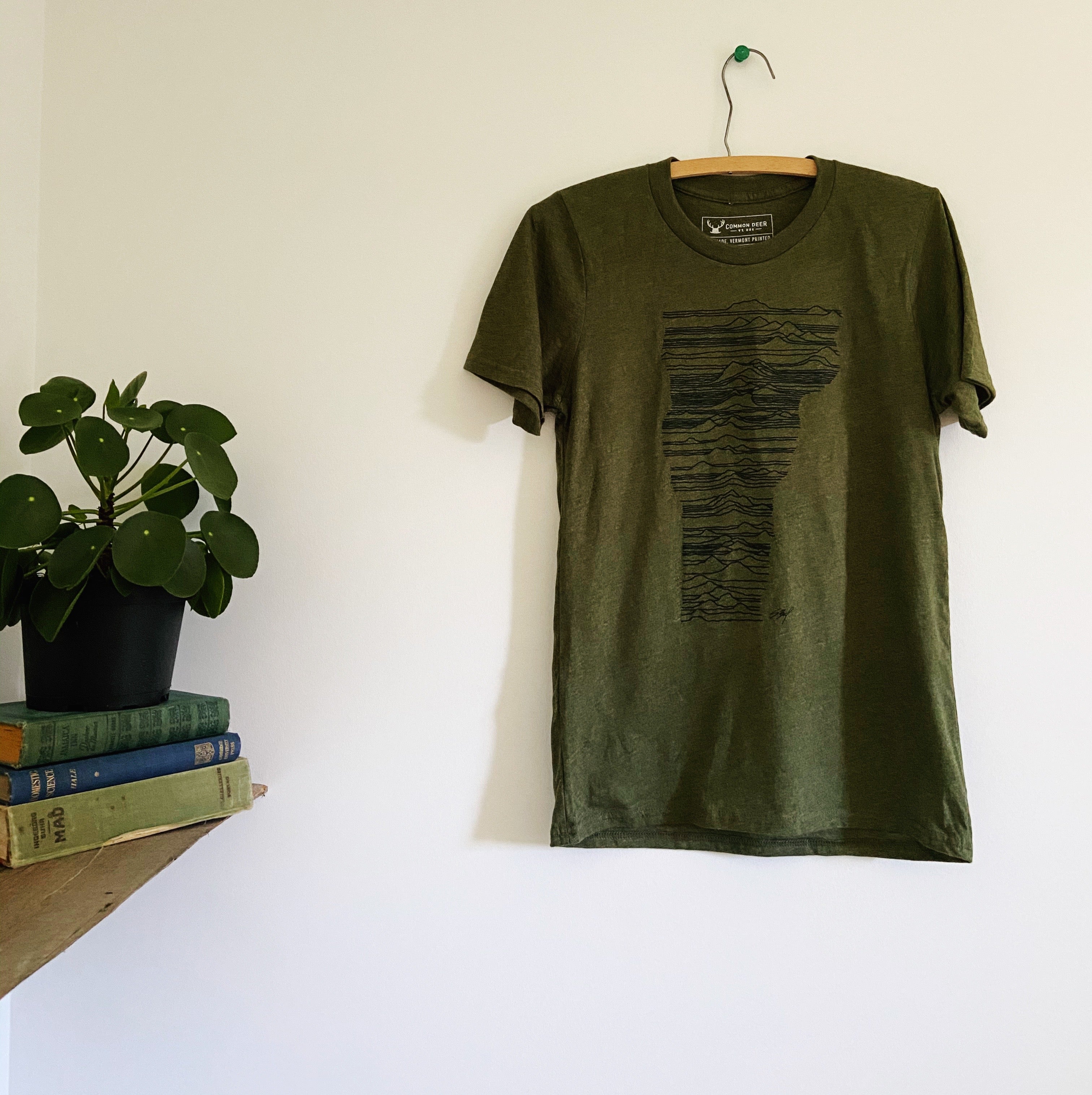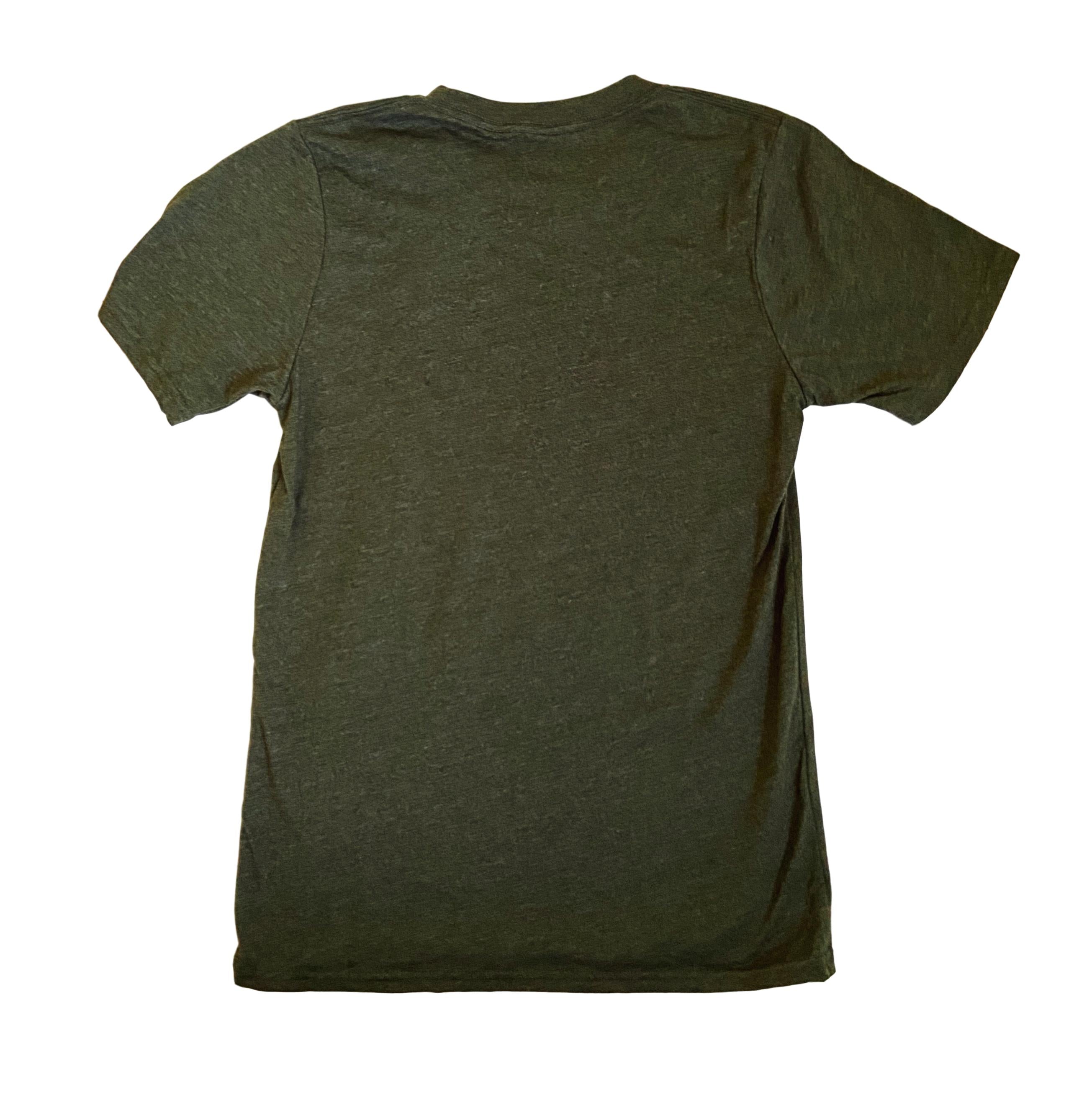 Shirt is a heathered army green, with black raised ink.
