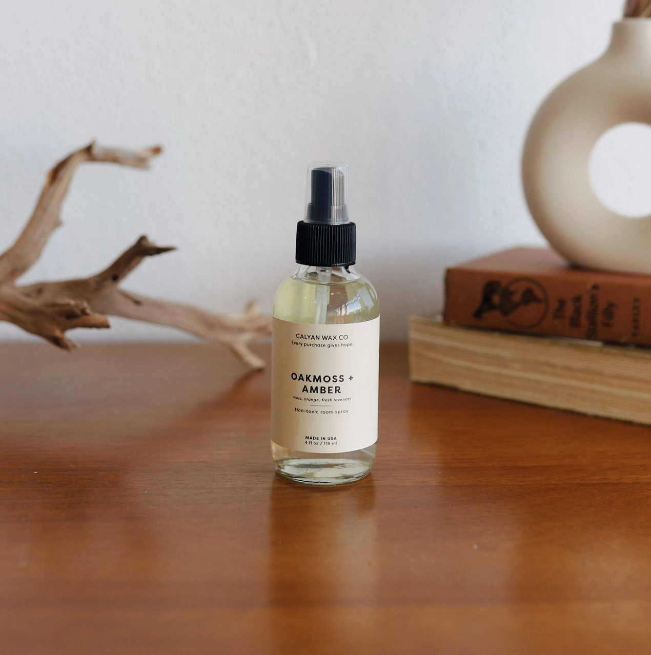 - 4 oz. of room spray in a reusable clear glass bottle with spray nozzle